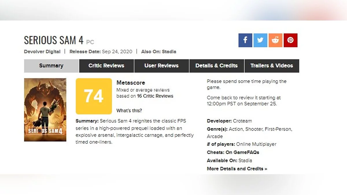 На момент написания новости средняя оценка на Metacritic составляет 74 балла. Serious Sam 4 оказалась вполне очевидным продолжением легендарной серии — с весёлым «ганплеем», но без каких-либо сюрпризов.