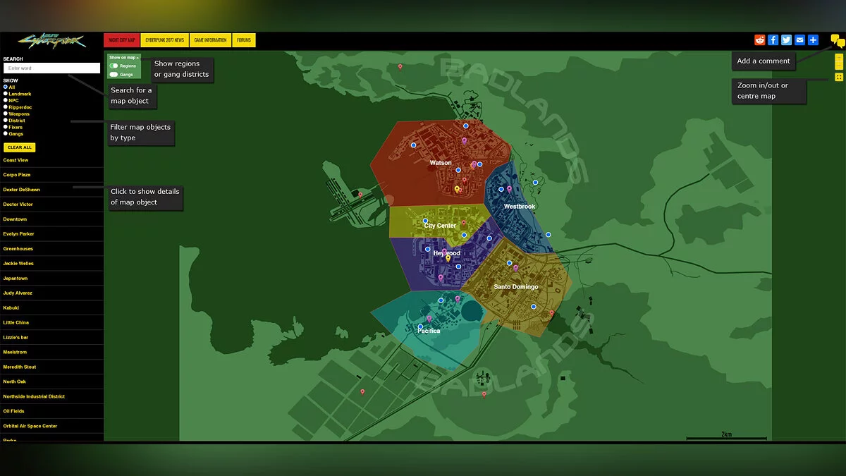 Там можно посмотреть на различные районы города, приближая их колесом мыши. Также можно включать и выключать отображение зон, где царствуют банды. Помимо этого, на сайте приводятся все самые свежие новости о Cyberpunk 2077.