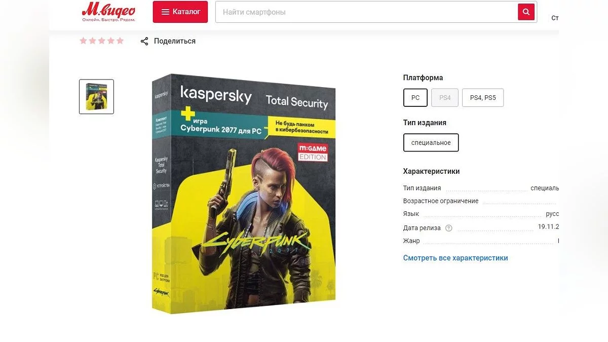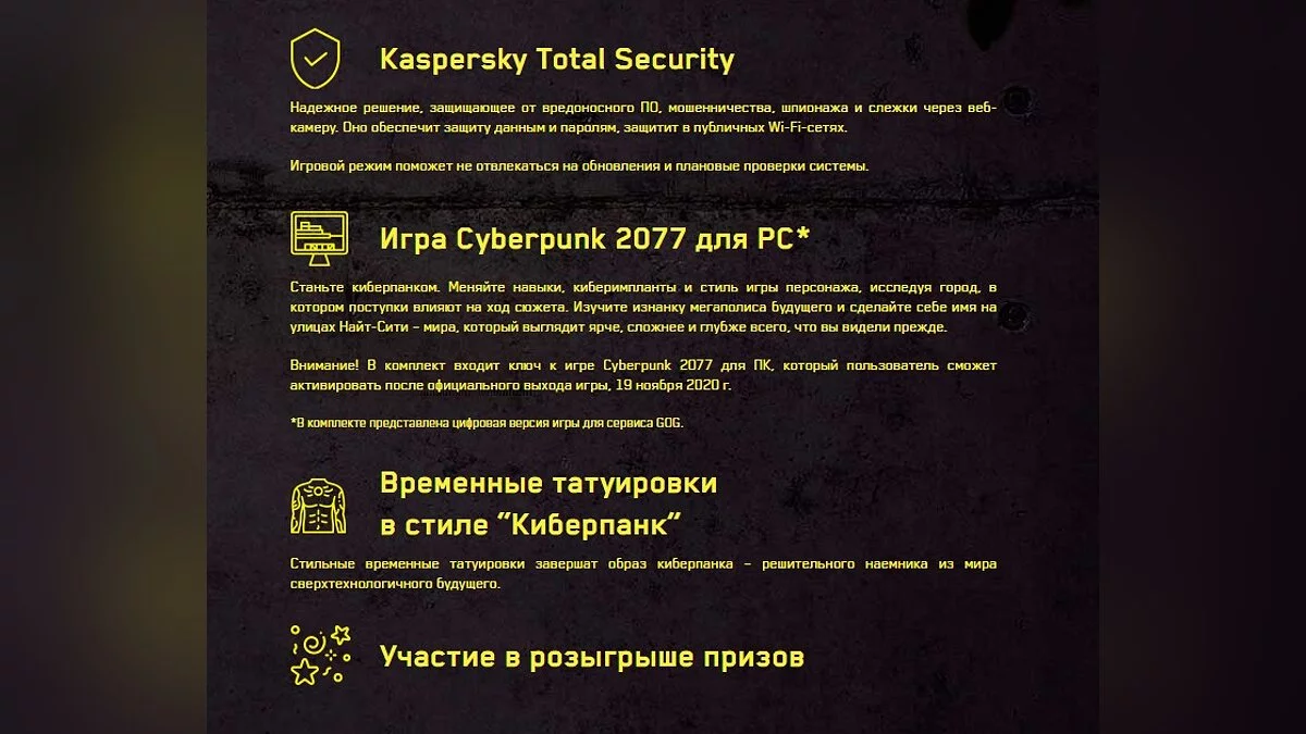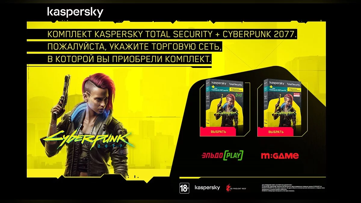 В некоторых российских магазинах появились наборы Kaspersky Total Security + Cyberpunk 2077, которые включают копию игры для PC (цифровая версия в сервисе GOG) и подписку на комплексную защиту для двух устройств на один год. Набор уже можно приобрести в «М.Видео» и «Эльдорадо» за 2990 рублей. А ещё есть набор временных татуировок по игре.