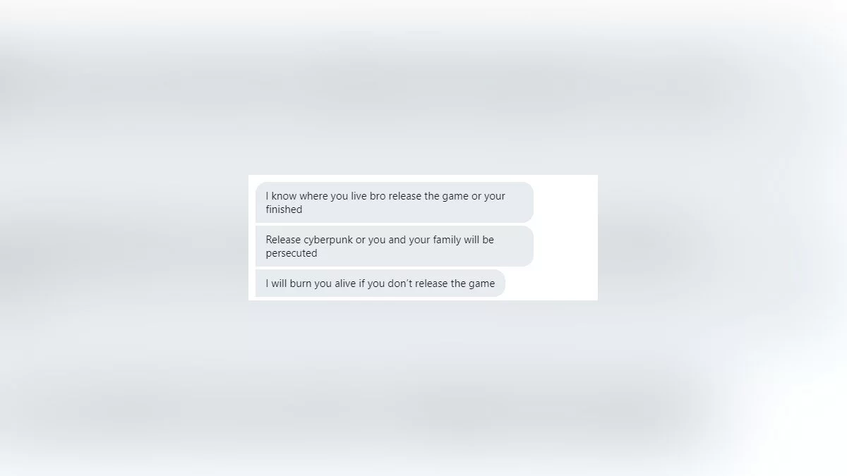 Я знаю, где ты живешь, братан. Выпускай игру, или тебе крышка. Выпускай Cyberpunk 2077, иначе тебя и твою семью казнят. Я сожгу тебя заживо, если ты не выпустишь игру.