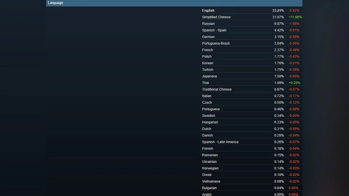 На Reddit юзер под псевдонимом wheelerman отметил, что по последним данным Steam английский язык с его 33,21%, который является самым популярным языком на площадке, скоро может обогнать китайский. За последний месяц упрощенный китайский добрал сразу 11,88% и занял второе место с 31,07%. Русским же языком пользуются 9,87% пользователей Steam.