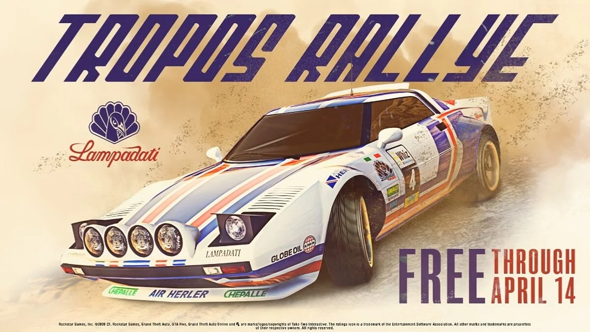 С 8 по 14 апреля 2021 года в GTA Online можно забрать раллийную Lampadati Tropos Rallye, которая отлично подходит для езды как по бездорожью, так и по асфальту. Чтобы бесплатно получить машину стоимостью 800 тысяч GTA $, нужно в игре зайти на сайт Southern San Andreas Super Autos и заказать доставку в гараж.