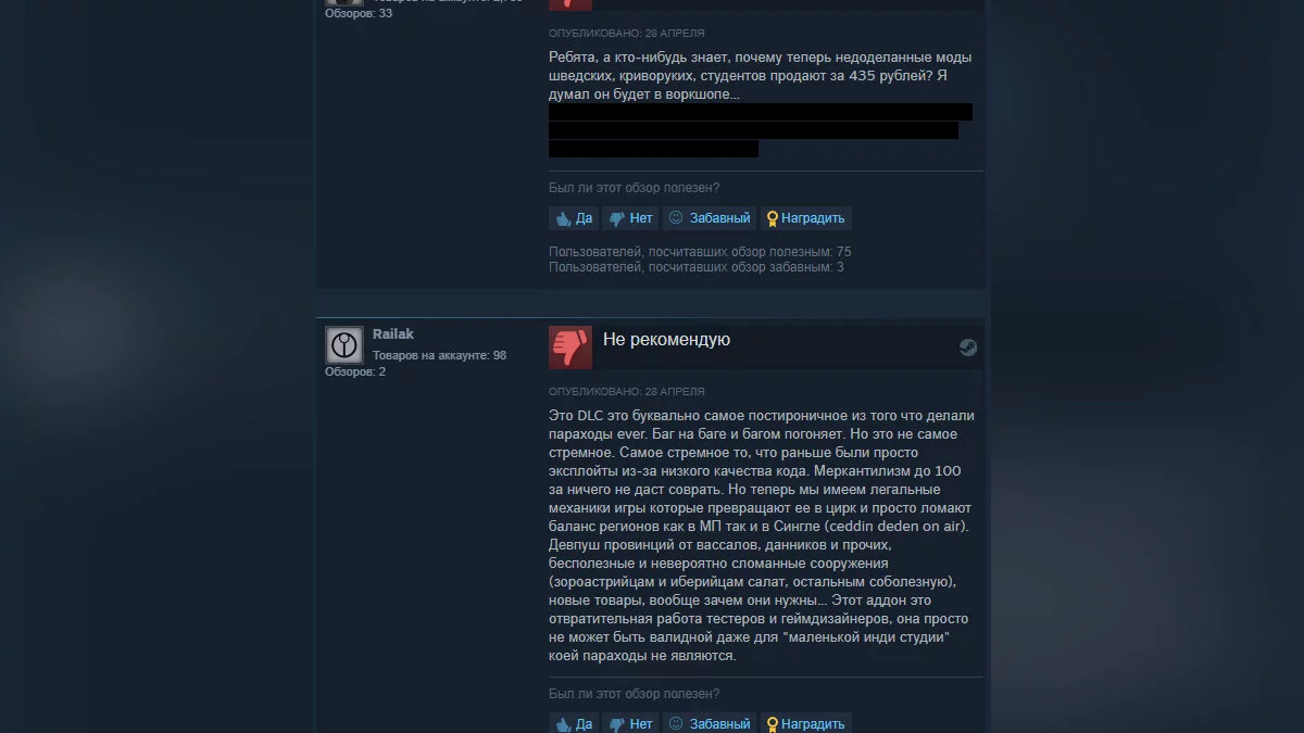 Всего за два дня это DLC получило свыше 1000 негативных отзывов. На момент написания новости рейтинг дополнения составляет 10%. Для сравнения у FlatOut 3: Chaos & Destruction он равен 14%. Примечательно, что у самой Europa Universalis 4 рейтинг очень неплохой — 87%.