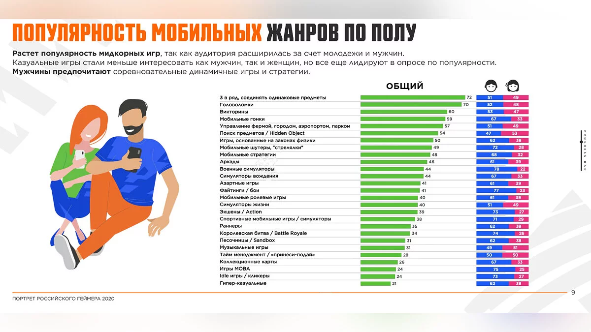 - Самыми популярными жанрами среди мобильных игр оказались «три в ряд» (72%), головоломки (70%), викторины (60%) и гонки (59%). Экшены предпочитают 39% игроков;