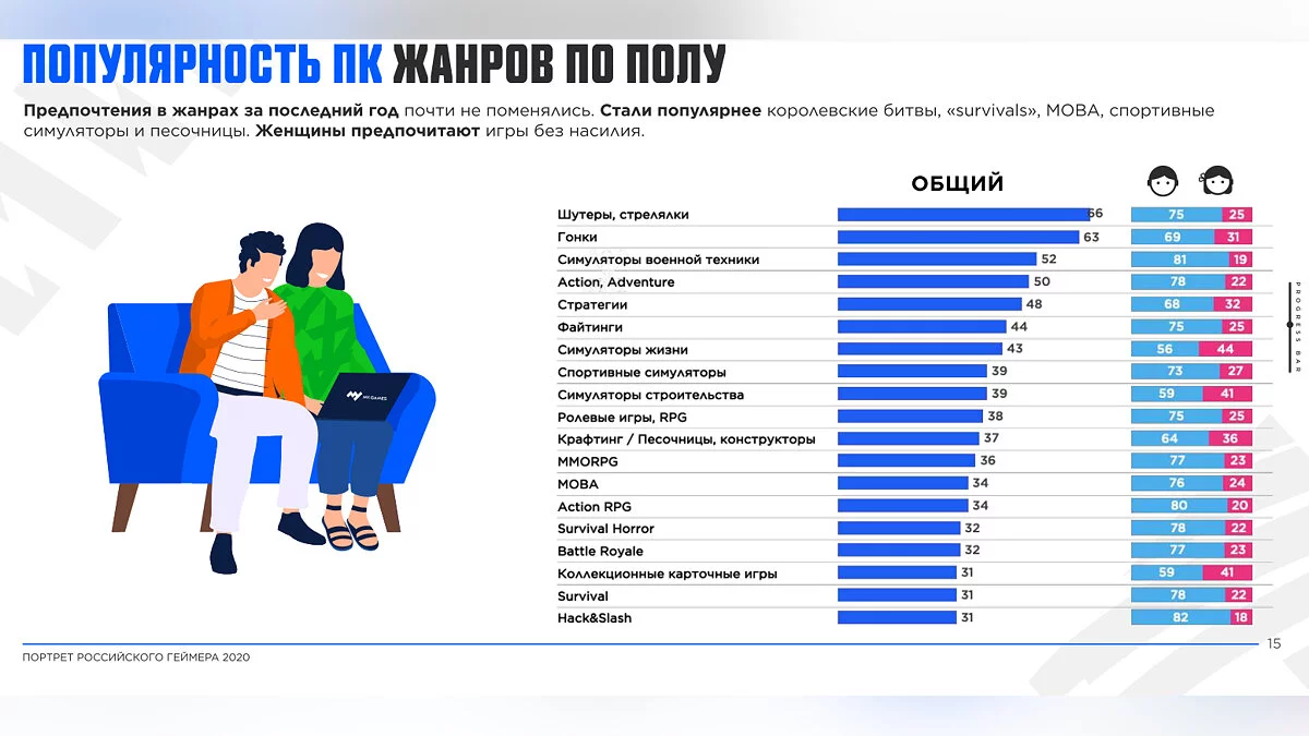 - На ПК самыми популярными жанрами выступают шутеры (66%), гонки (63%), симуляторы военной техники (52%), приключенческие экшены (50%) и стратегии (48%). Менее популярны среди российских PC-геймеров выживалки (31%), Hack and slash (31%) и коллекционные карточные игры (31%);