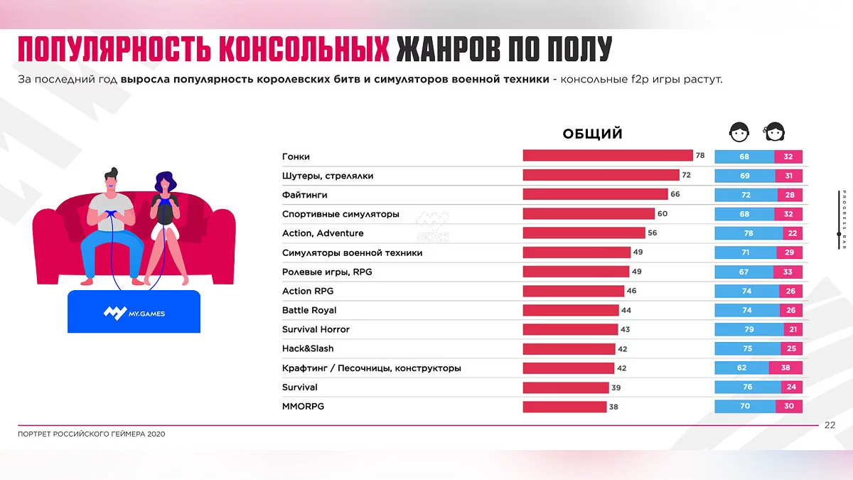 - На консолях самыми популярными жанрами выступают гонки (78%), шутеры (72%), файтинги (66%), спортивные симуляторы (60%) и приключенческие экшены (56%). Наименьшим спросом пользуются MMORPG (38%).