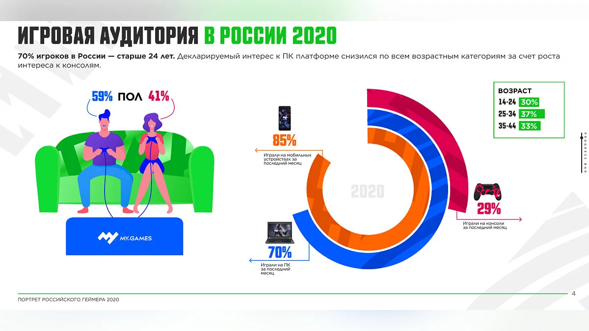 - Игровая аудитория по возрасту — 14-24 года (30%), 25-34 года (37%), 35-44 года (33%);