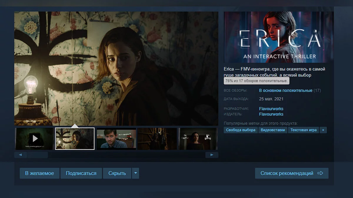 В Steam состоялся релиз еще одной игры, которая раньше была PS4-эксклюзивом. Ей является интерактивный триллер от британской студии Flavourworks под названием Erica.