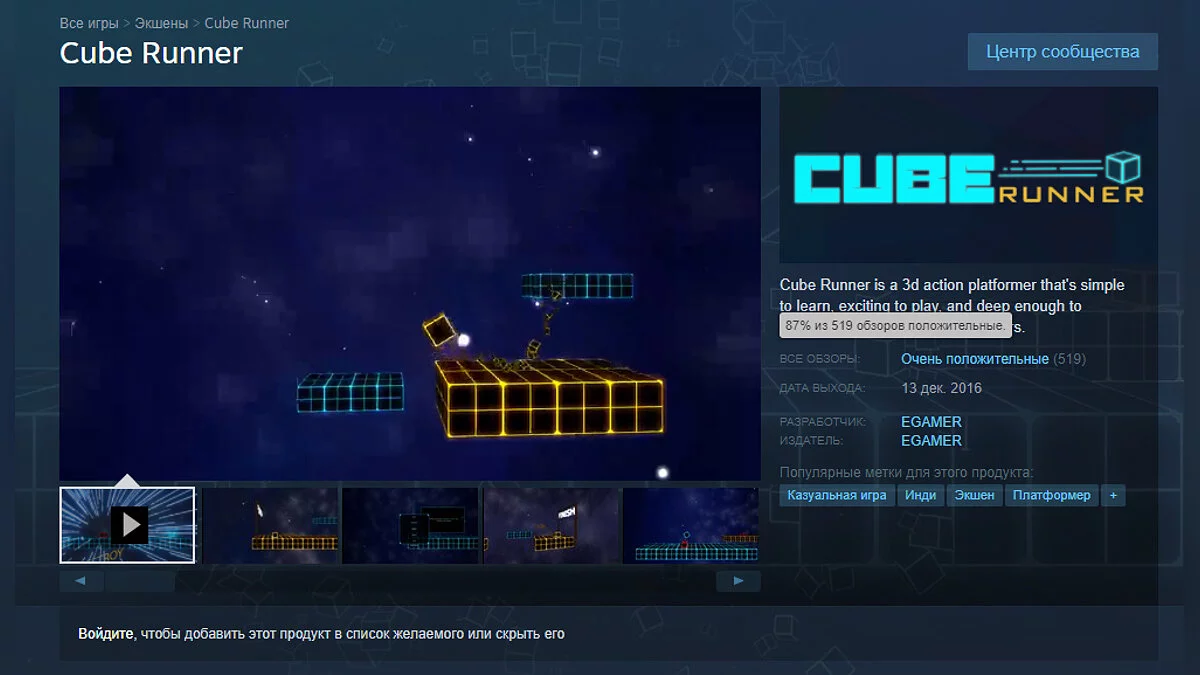 Cube Runner представляет собой трехмерный платформер с минималистичной графикой, выполненной в виде неоновых кубиков. К особенностям разработчики относят разнообразные уровни и легкий в освоении геймплей.