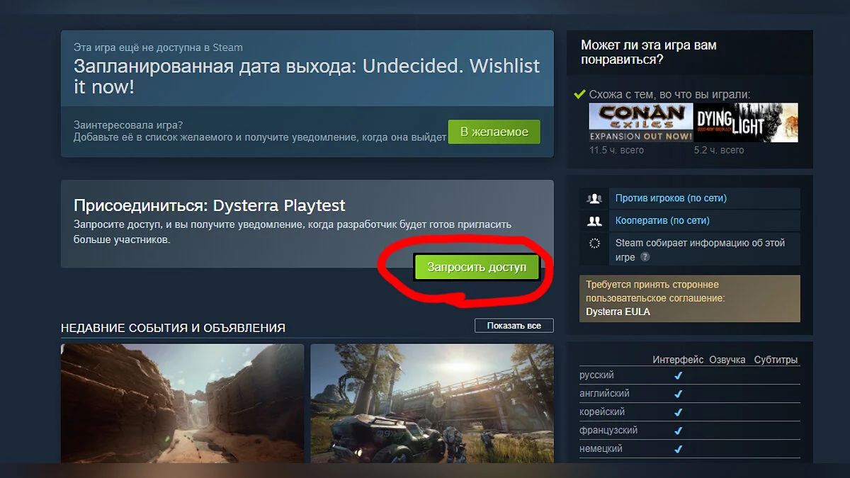 Зарегистрироваться на тестирование можно на страничке игры в Steam. В случае одобрения заявки разработчик вышлет письмо с инвайтом на электронную почту, которая прикреплена к профилю.