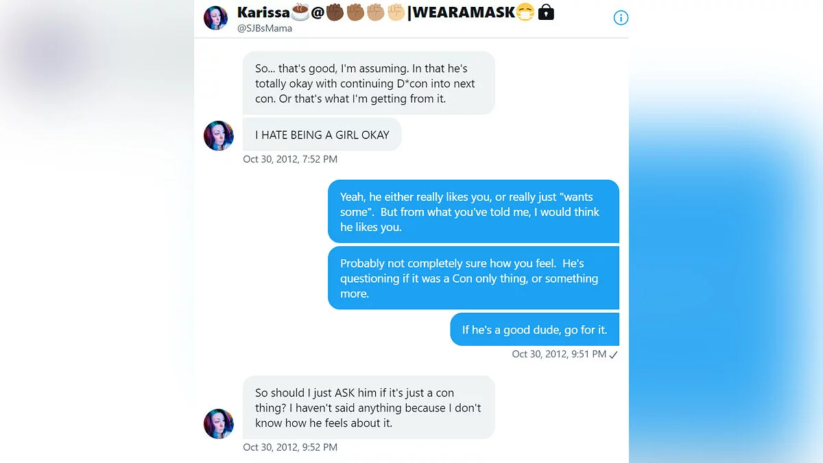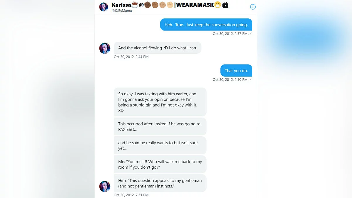 Карисса Бэрроуз и Джефф Джонсон вместе участвовали в подкасте Koobismo, посвящённом известным личностям в игровой индустрии. В личных сообщениях Бэрроуз обсуждала с Джонсоном их отношения с Авеллоном. Женщина хотела встречаться с популярным дизайнером, но боялась узнать, что он чувствует по этому поводу. Джонсон советовал быть открытой и продолжаться общаться с Авеллоном.