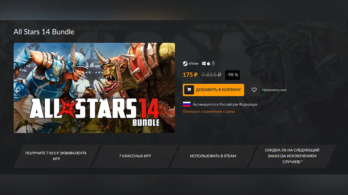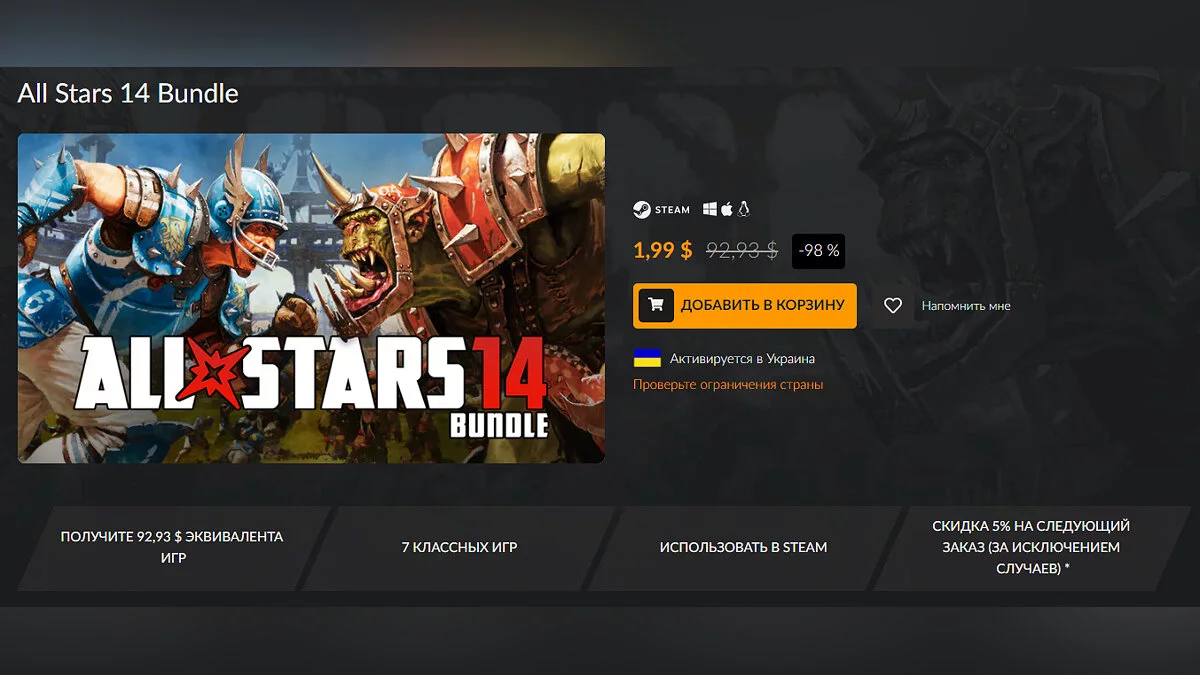 Общая стоимость игр в Steam составляет 2969 рублей (в российском регионе). Купить бандл All Stars 14 Bundle можно здесь.