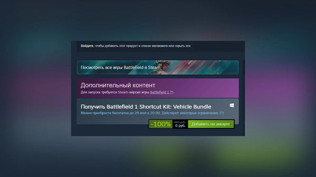 Стоит заметить, что сейчас в Steam также проходит полноценная бесплатная раздача дополнения Shortcut Kit: Vehicle Bundle для Battlefield 1, которое включает в себя все комплекты для техники. Забрать DLC можно до 29 июля (20:00 МСК), но для этого у вас должна быть куплена базовая версия игры.