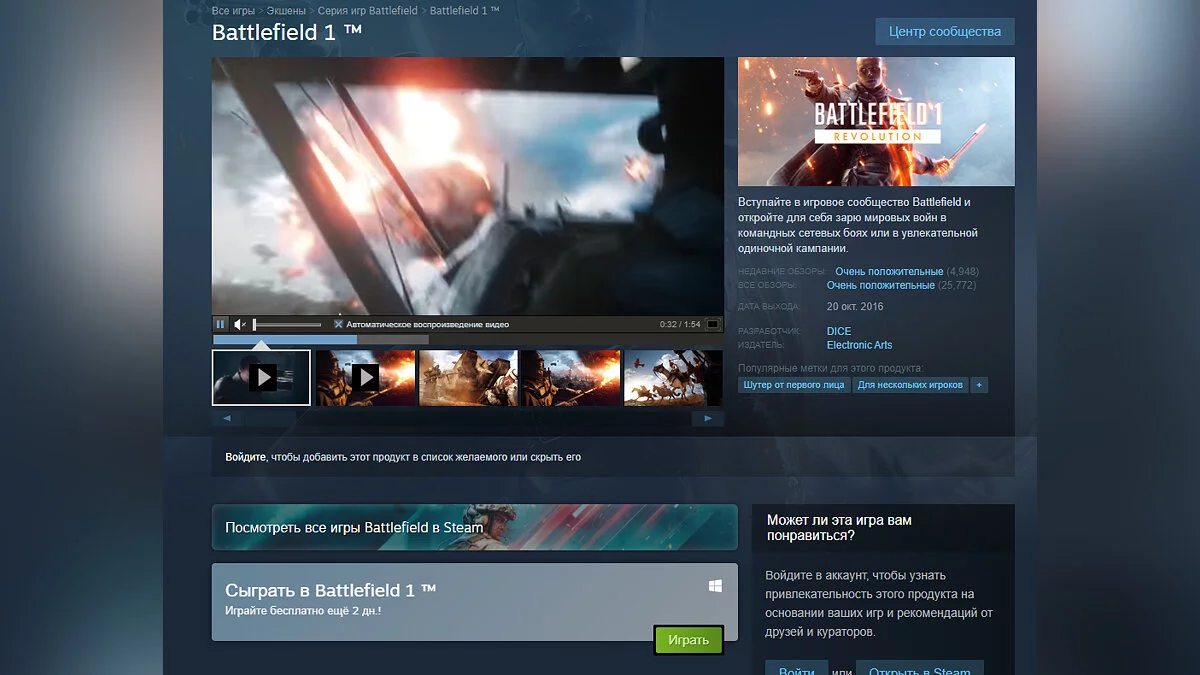 Скачать Steam-версию Battlefield 1 можно здесь (бесплатные выходные продлятся до 25 июля, 23:00 МСК).