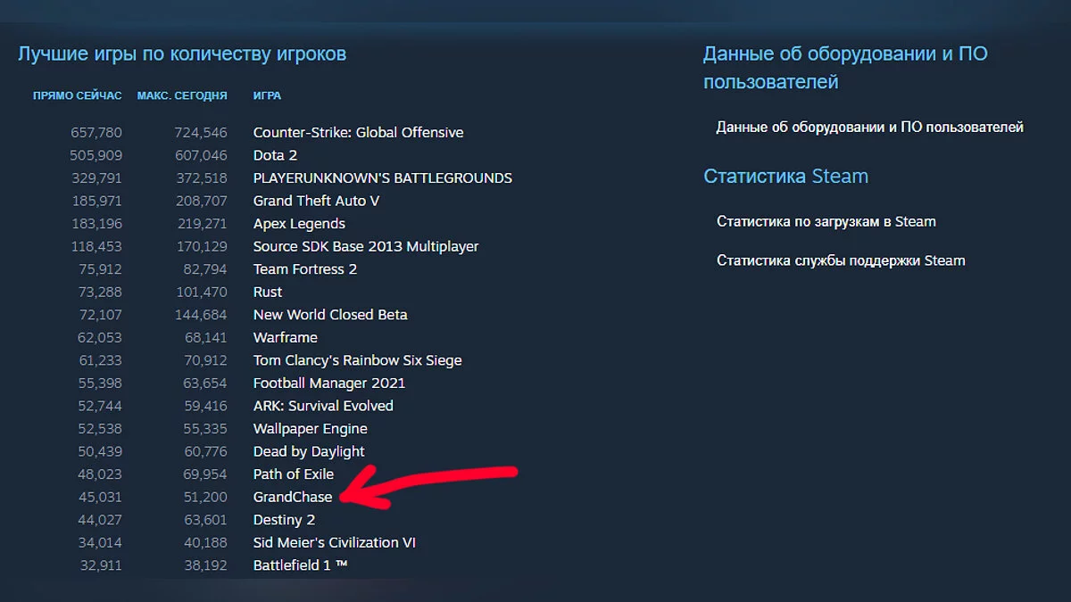 Кроме того, GrandChase попала в ТОП-20 игр с самым большим онлайном (51 тыс. игроков за сегодня).