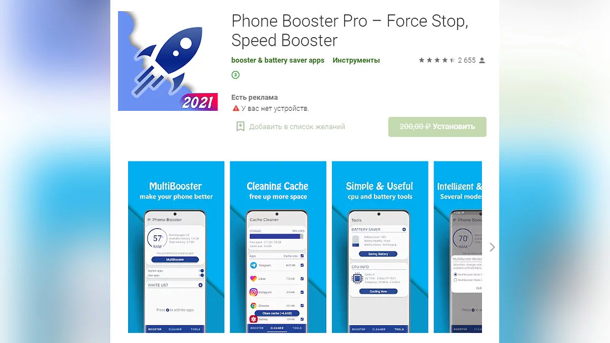 - Phone Booster Pro — Force Stop, Speed Booster — программа, которая оптимизирует производительность устройства, ускоряя его работу и снижая температуру (загрузить бесплатно).