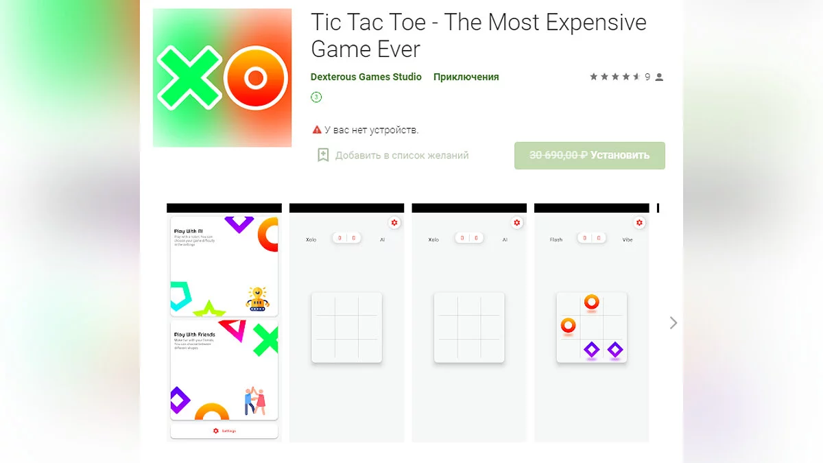 - Tic Tac Toe — The Most Expensive Game Ever — еще одна игра, которая до акции стоила 30,6 тыс. рублей. Она представляет собой цифровую версию «Крестиков-ноликов» (загрузить бесплатно);