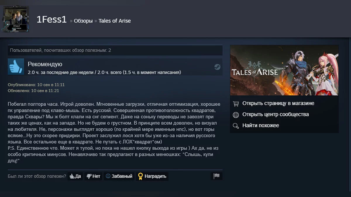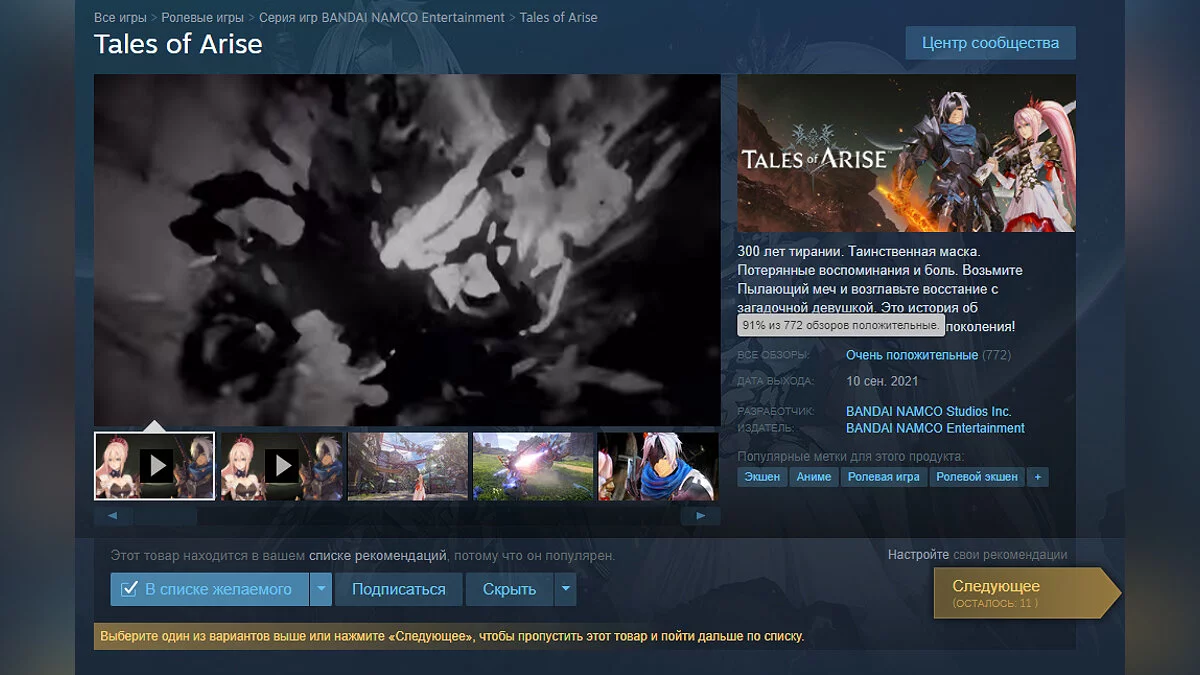 Сегодня ночью состоялся релиз ролевой игры с элементами экшена под названием Tales of Arise, которую разработала Bandai Namco Studios. Всего за день проект попал в топ самых популярных игр (по количеству игроков в онлайне) в Steam и получил 91% положительных отзывов на основе свыше 700 пользовательских обзоров.