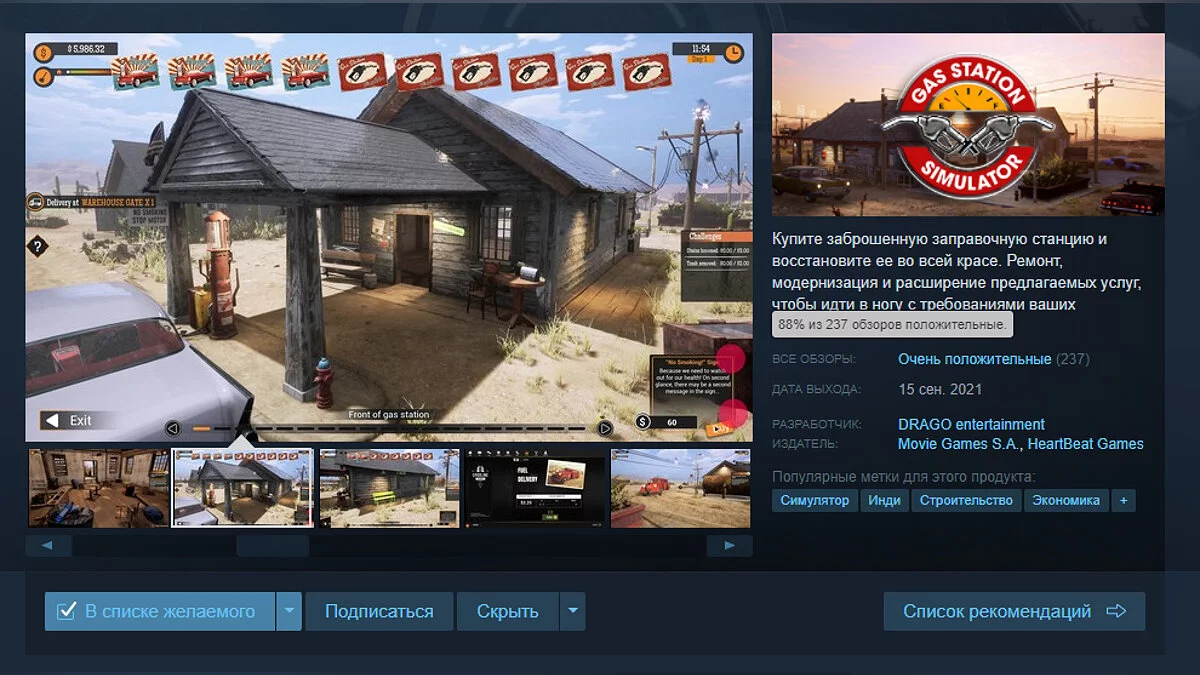 Купить Gas Station Simulator в Steam можно за 391 рубль с учетом скидки 10%, которая действует до 22 сентября. Есть также бесплатная демка.