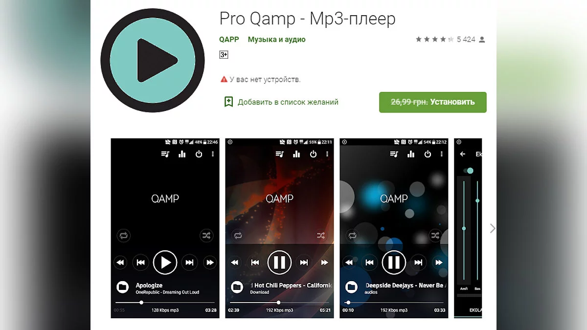 - Pro Qamp — музыкальный проигрыватель с 10-полосным эквалайзером и поддержкой популярных форматов, включая mp3, mp4, m4a (включая alac), ogg, wma, flac, wav, ape, wv, tta, mpc и aiff (загрузить бесплатно).