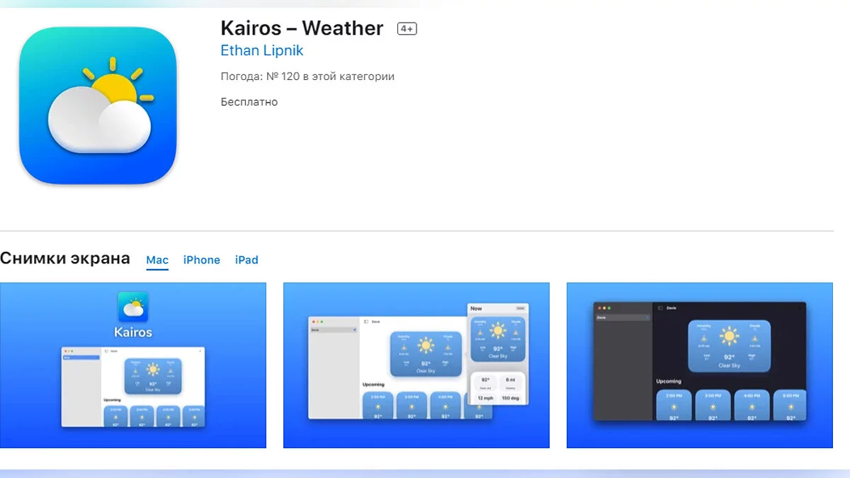 - Kairos — Weather — приложение для того, чтобы получать точную и актуальную информацию о погоде в тех или иных регионах (загрузить бесплатно).