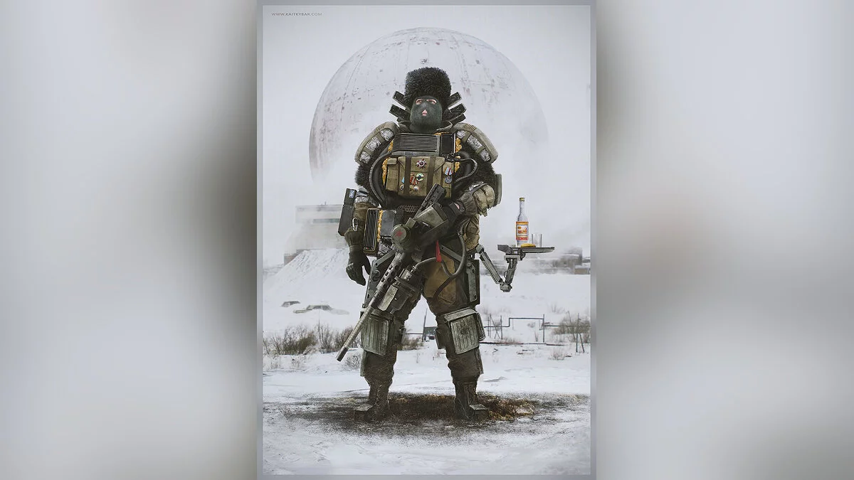 Близкими по духу к S.T.A.L.K.E.R. в работах автора можно найти ещё два изображениях. На одном из них представлен солдат в экзоскелете и ушанке.