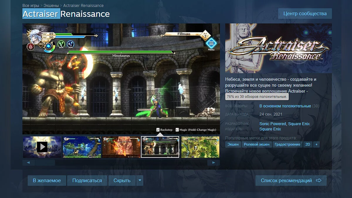 На момент написания новости, в Steam у Actraiser Renaissance 76% положительных отзывов от геймеров.