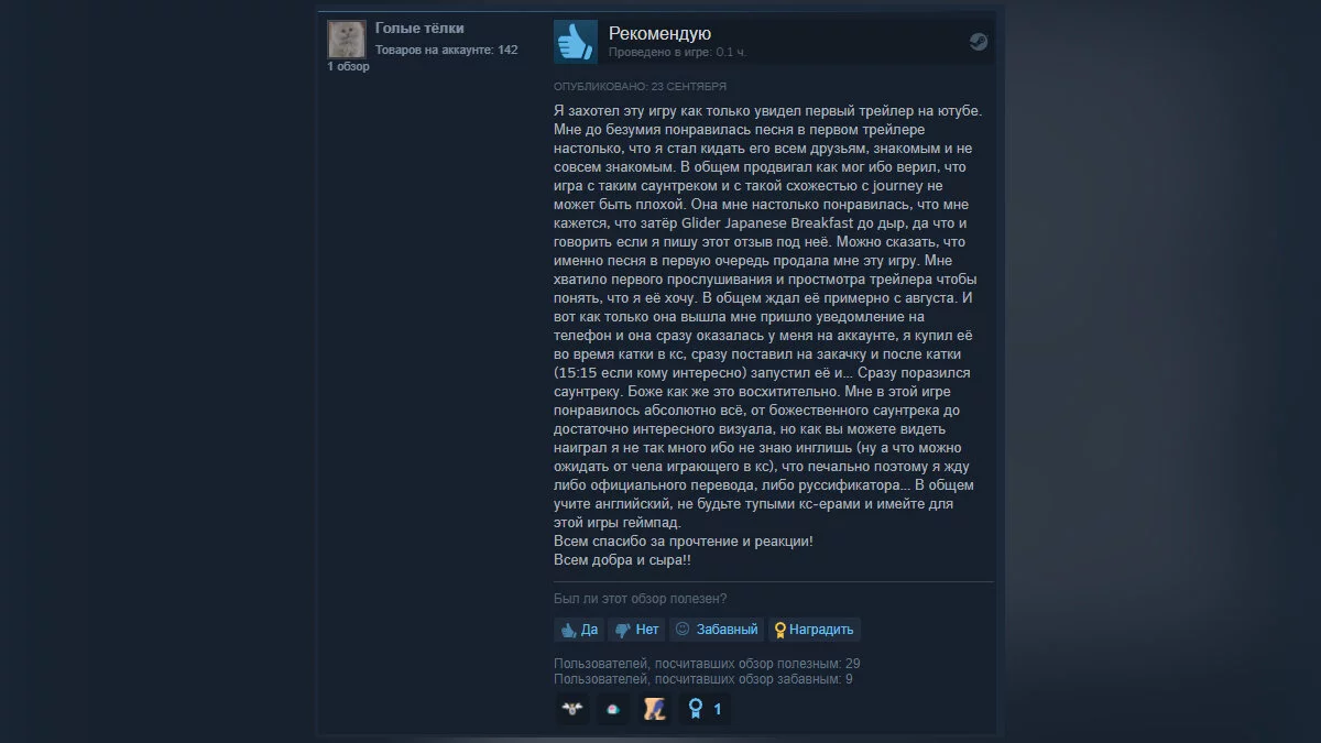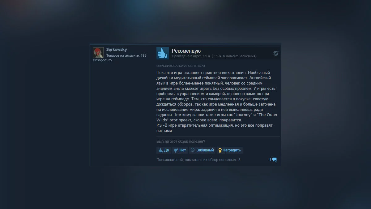В Steam Sable на момент написания новости получила 86% положительных отзывов. Некоторые игроки сравнивают ее по атмосфере с адвенчурой Journey.