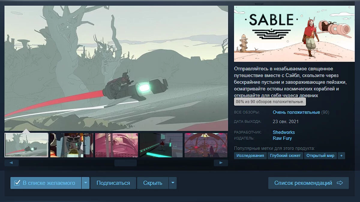 Купить Sable можно в Steam (495 руб), Epic Games Store (549 руб), GOG (495 руб) и Xbox Store ($24,99). Игра входит в Xbox Game Pass Ultimate.
