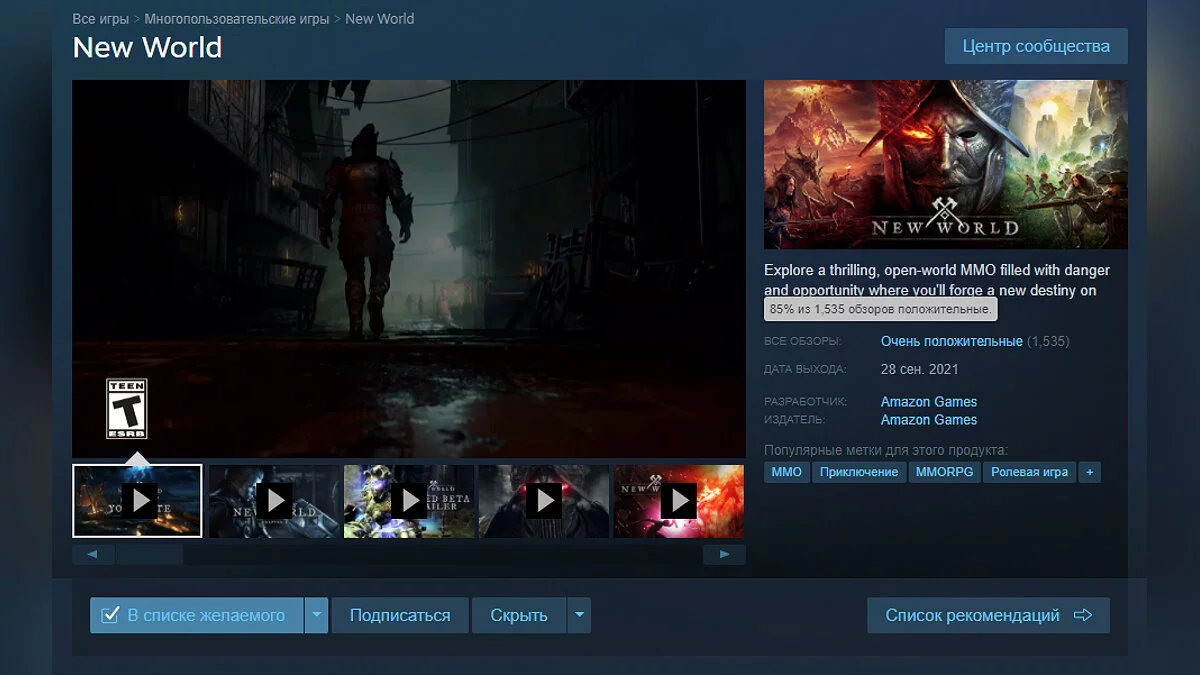 На момент написания новости New World имеет рейтинг 85%, сформированный на основе 1,5 отзывов. Стоит заметить, что многие игроки пока еще ждут своей очереди на серверах, но у некоторых уже получилось попасть в игру. Обратите внимание, что со временем рейтинг может измениться.