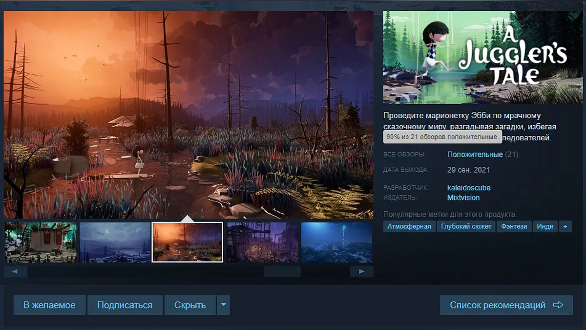 Купить A Juggler's Tale можно в Steam (359 рублей), GOG (359 рублей), Epic Games Store (359 рублей), PS Store (1069 рублей), Xbox Store ($17,99) и Nintendo eShop (1349 рублей).