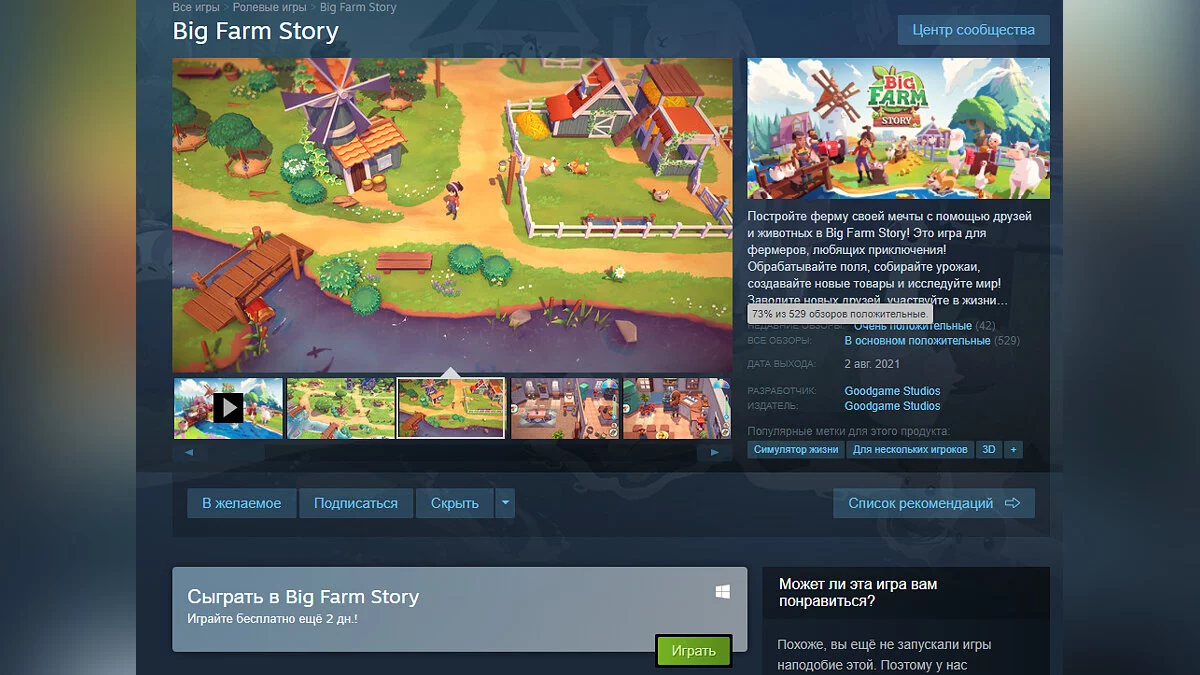 У игры 73% положительных отзывов. Скачать Big Farm Story можно здесь. Играть бесплатно можно до 10 октября (23:00 МСК).