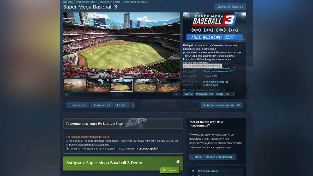 У игры 92% положительных отзывов. Скачать Super Mega Baseball 3 можно здесь. Играть бесплатно можно до 11 октября (20:00 МСК).