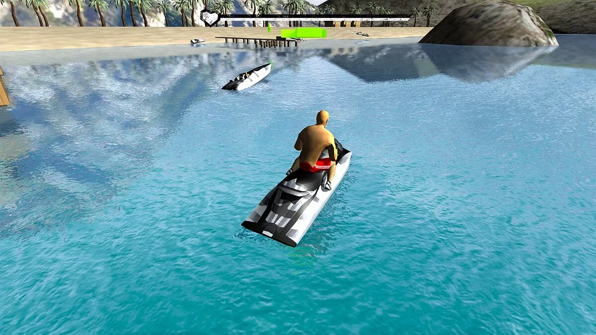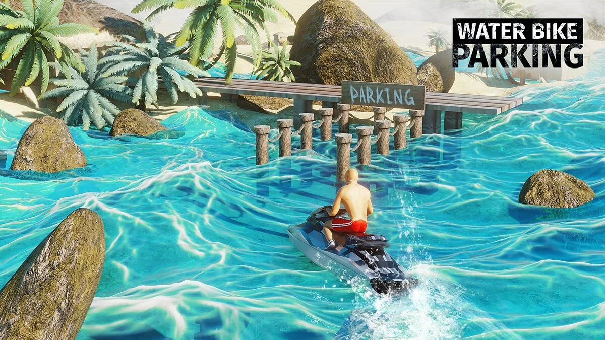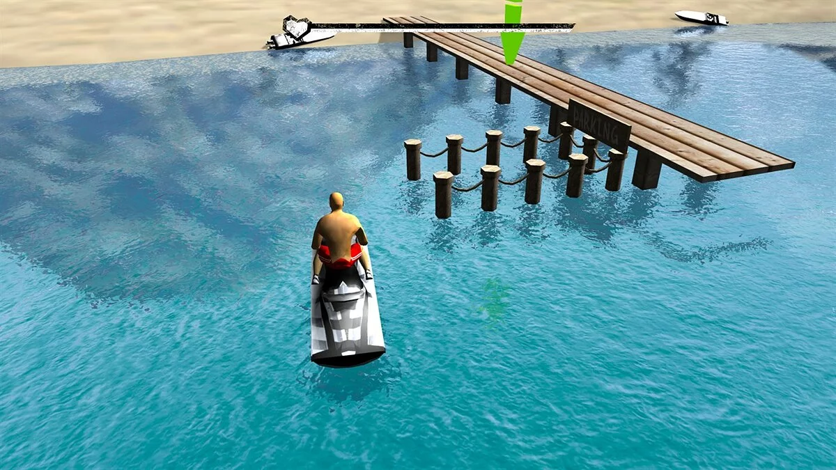 Water bike parking — Jet Ski Driving Simulator: Obstacles Racing — гонка на гидроциклах, в которой вместо обычных трасс игрокам предстоит научиться управлять транспортом на водной поверхности. Среди особенностей выделяют реалистичную физику вождения. Играть можно как на ПК, так и на мобильном устройстве.