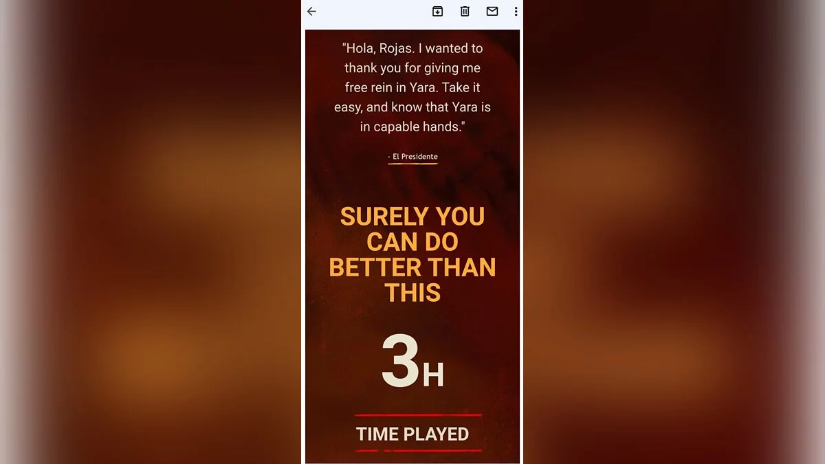 Пользователи сообщили, что получили от Ubisoft письма на электронную почту от имени Эль Президенте из Far Cry 6. В нём указывается количество часов, проведённое в свежем шутере. При этом главный злодей обращается к игроку с насмешкой.