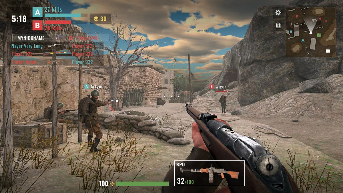 В игре доступны герои разных стран, включая США, СССР, Германию, Японию и не только. Есть шесть уникальных карт, а также следующие режимы: «Командный бой», «Против всех» и «Королевская битва» (ранний доступ).