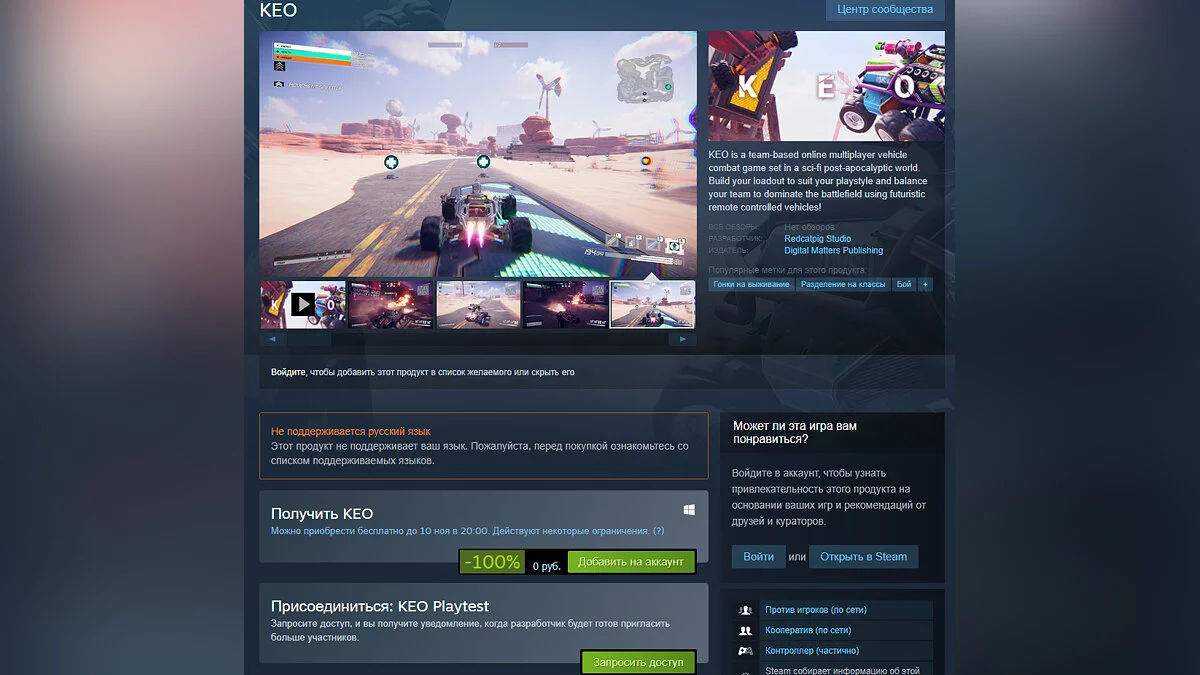 В Steam можно бесплатно получить игру под названием KEO. Это постапокалиптические гонки на выживание с мультиплеером. Примечательно, что этот проект еще даже не вышел.
