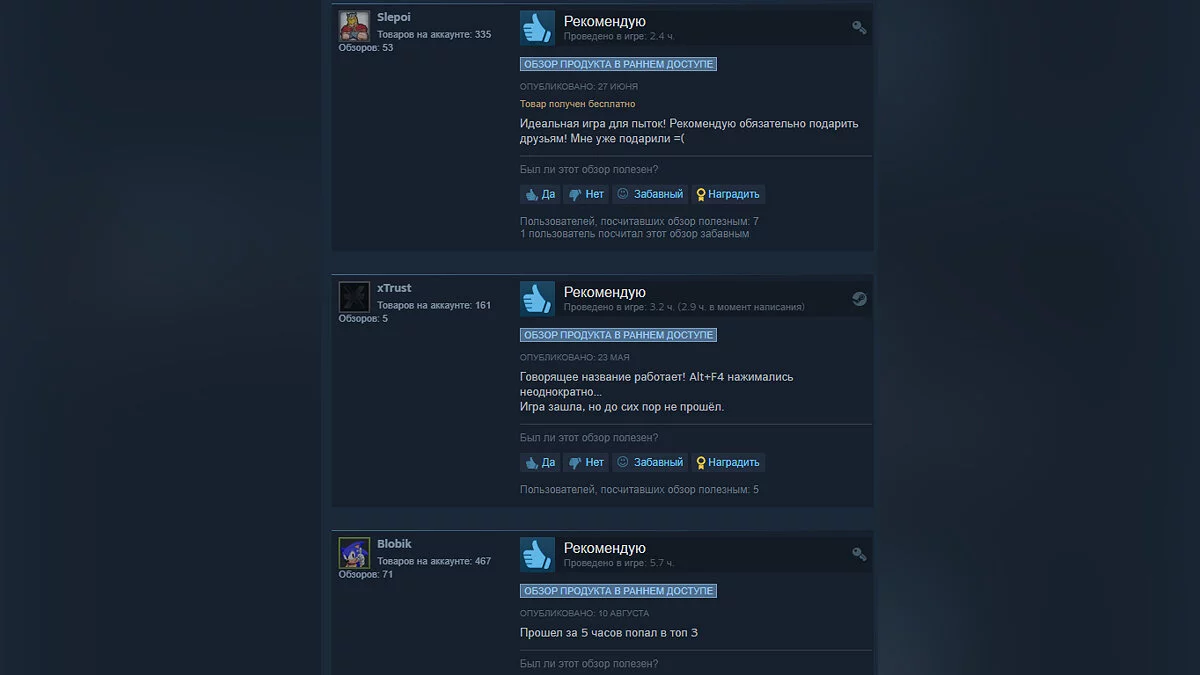 На момент написания новости рейтинг ALTF4 составляет 81%. Геймеры называют ее «игрой для пыток» и «отличным способом убить свои нервы». «После 10 минут игры я моментально нажал Alt+F4, ставлю класс», — написал один из игроков в своем отзыве.
