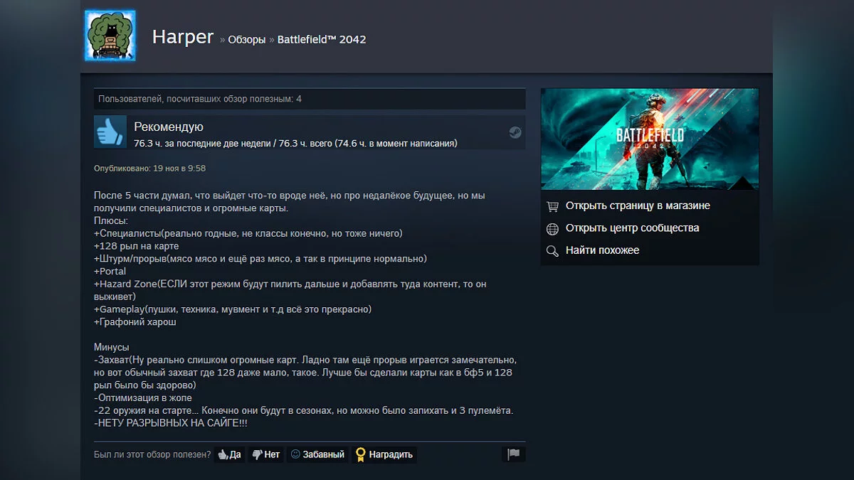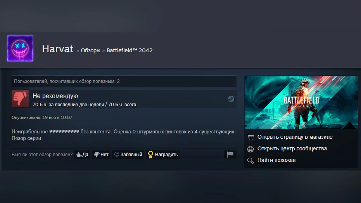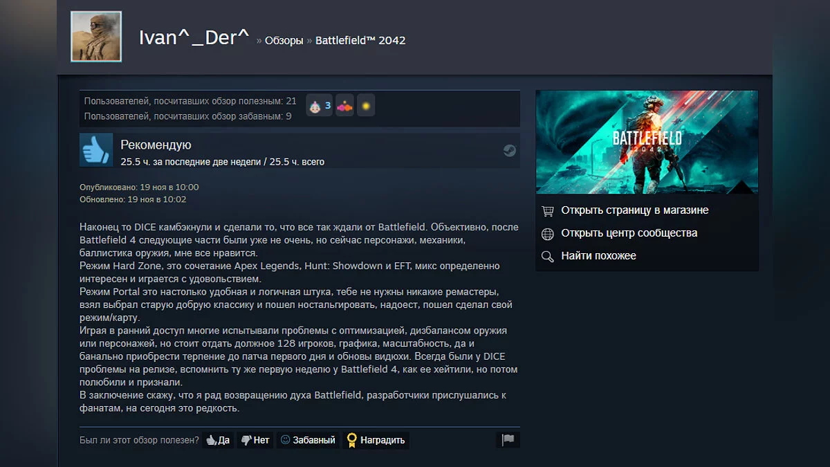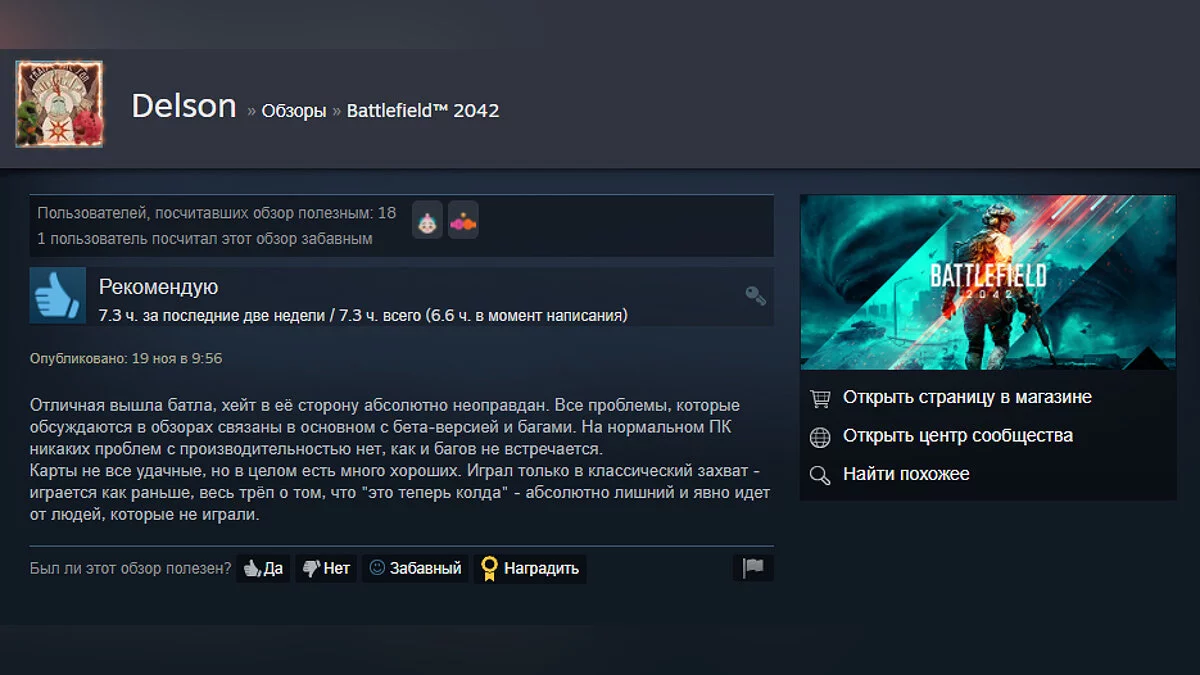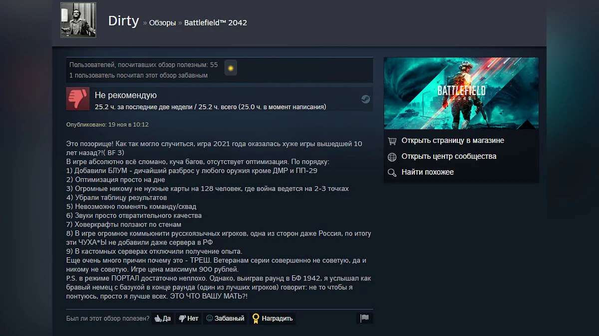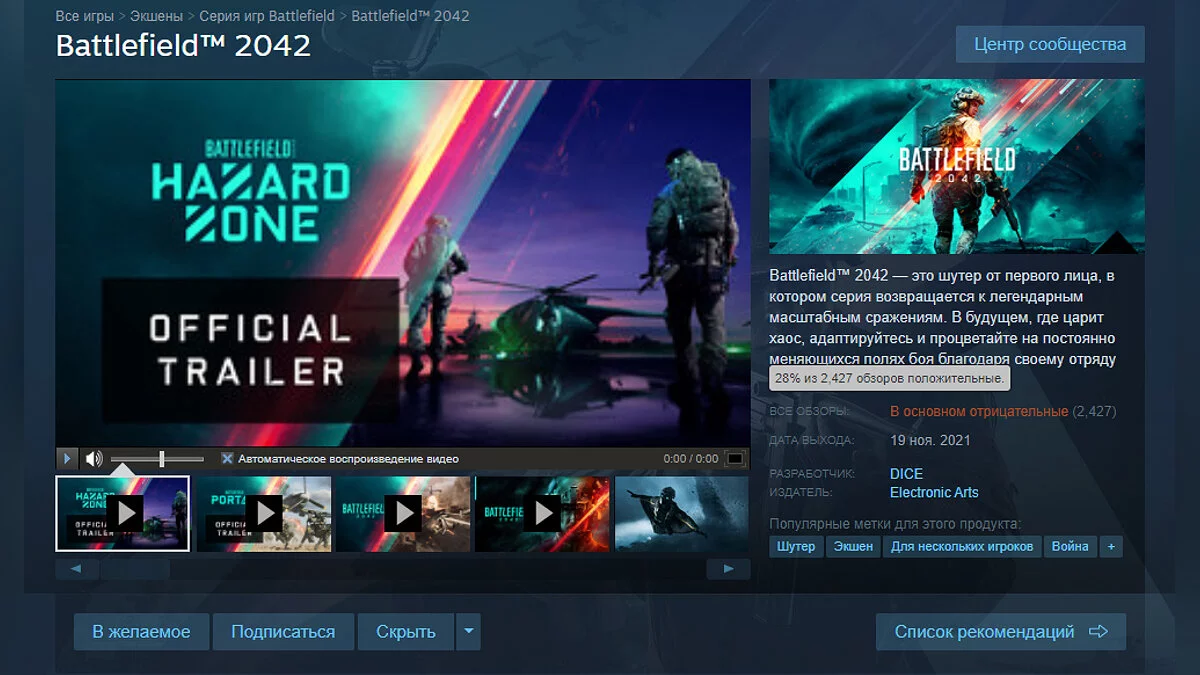 На момент написания новости рейтинг Battlefield 2042 составляет 28%. Таким образом, игра получила в основном отрицательные отзывы, но есть и те, кому новый шутер DICE понравился.