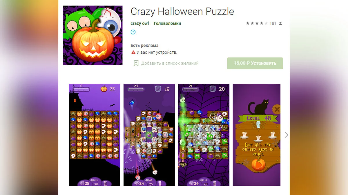 - Crazy Halloween Puzzle — головоломка в формате «три в ряд» на тему Хэллоуина, в которой игрокам доступны 288 уровней (загрузить бесплатно);