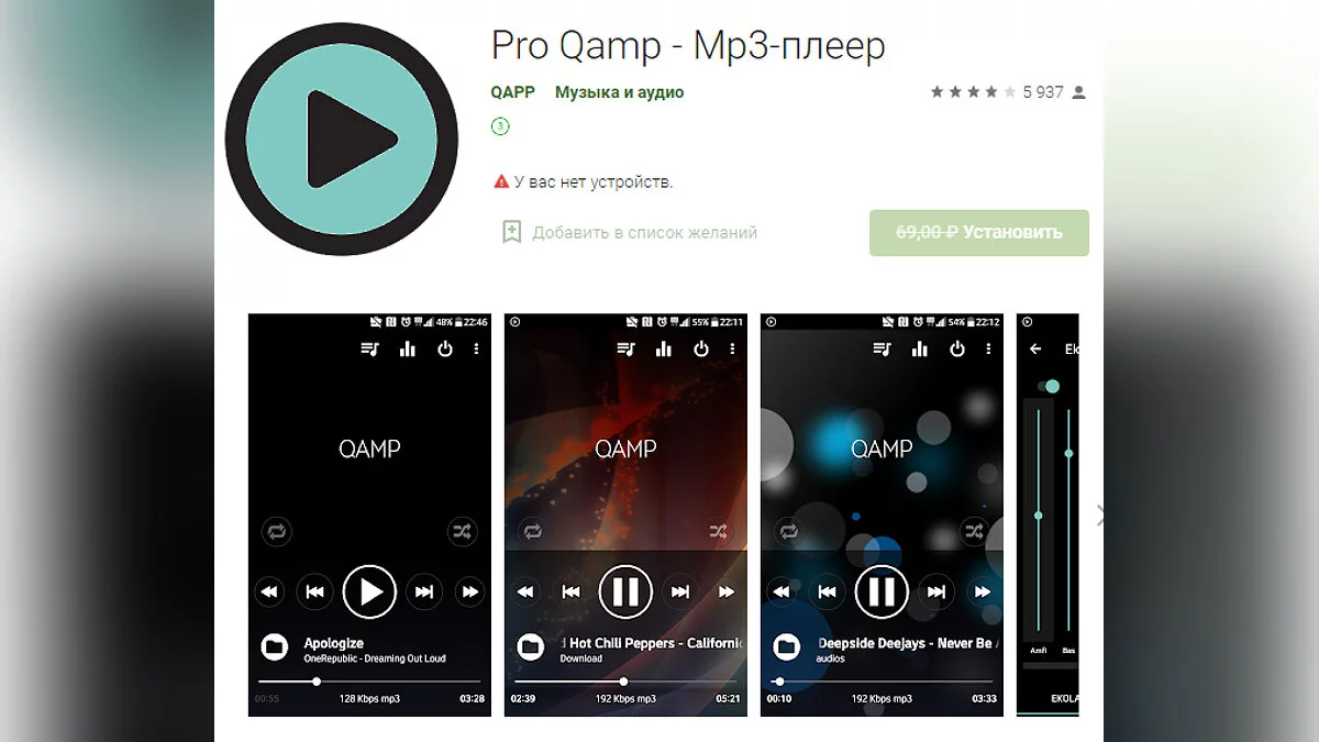 - Pro Qamp — альтернативный музыкальный проигрыватель с десятиполосным эквалайзером (загрузить бесплатно);
