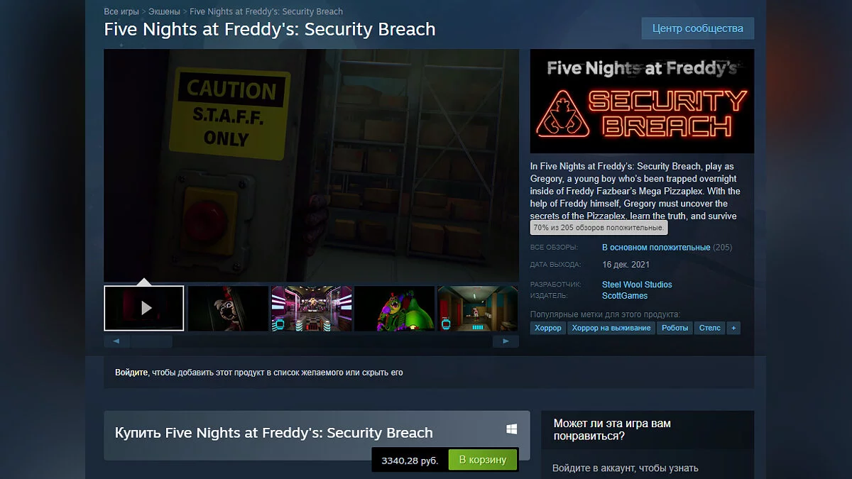 На момент написания новости в Steam Five Nights at Freddy's: Security Breach продают за 3340 рублей. В PS Store игра стоит 2849 рублей.