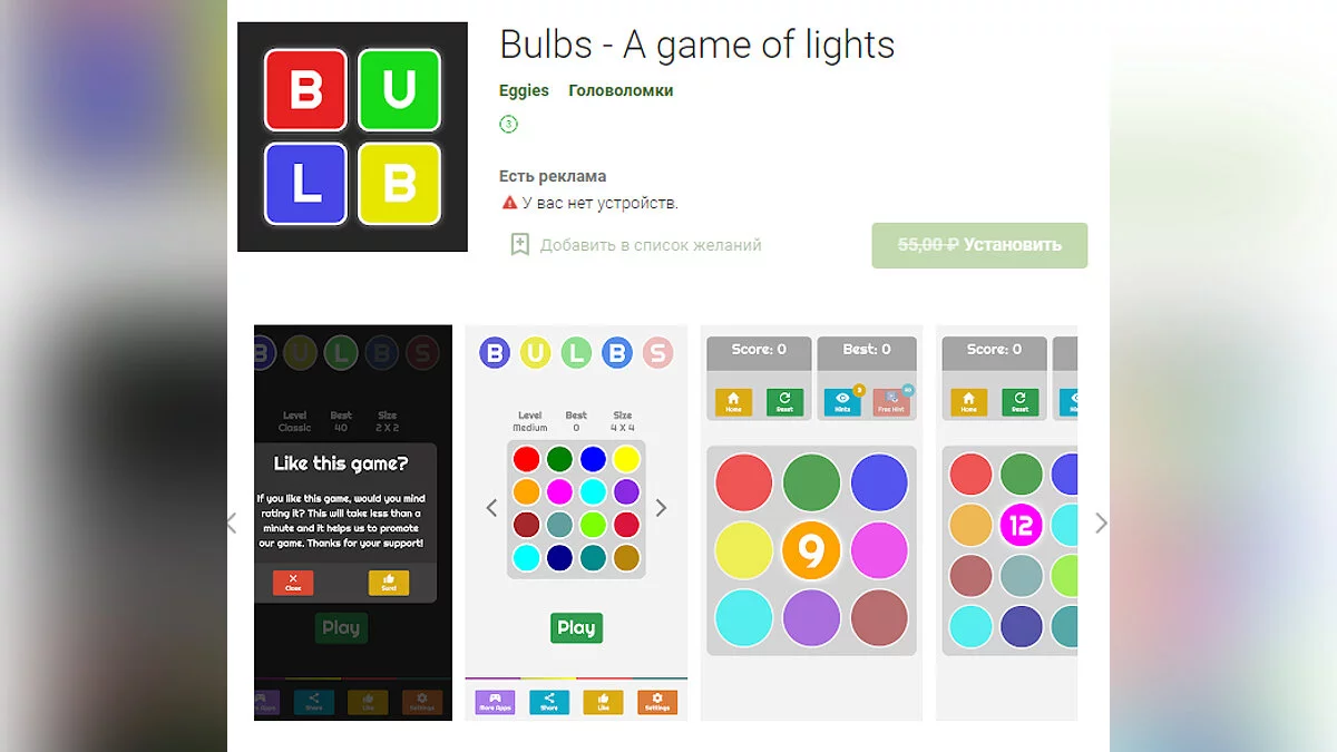 - Bulbs — A game of lights — увлекательная головоломка, в которой нужно запоминать последовательность мигающих цветных кругов (загрузить бесплатно);