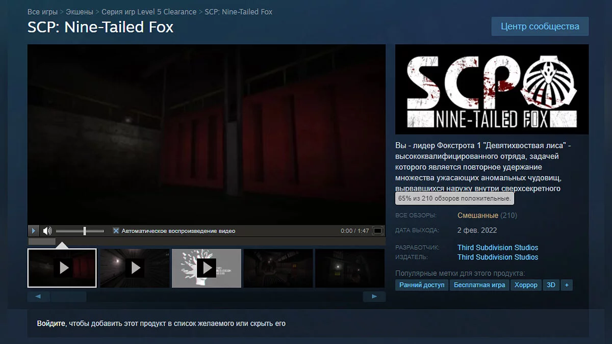 Студия Third Subdivision выпустила в раннем доступе Steam шутер от первого лица с элементами хоррора на выживание SCP: Nine-Tailed Fox, который, как и следует из названия, перекидывает игроков во вселенную знаменитой вымышленной секретной организации «Фонд SCP». Ее цель — исследование аномальных артефактов и сущностей, угрожающих нормальной жизни в мире.