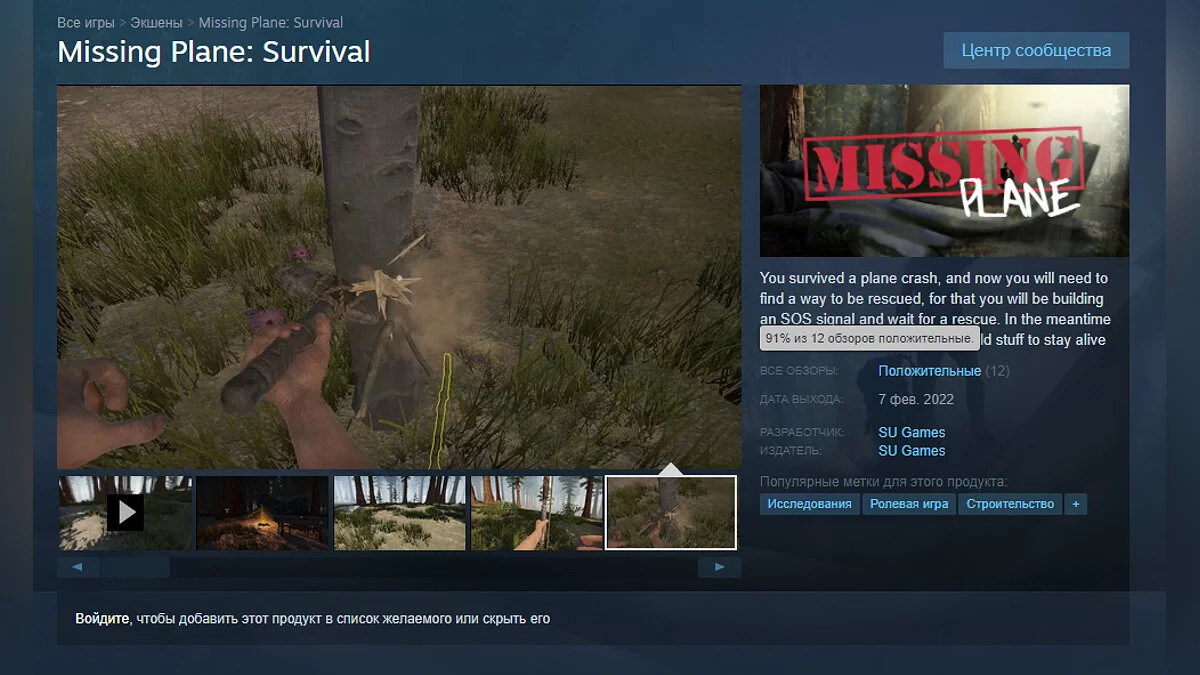 В Steam состоялся релиз нового симулятора выживания Missing Plane: Survival. В первый же день игра получила положительные отзывы от геймеров — 91% на момент написания.