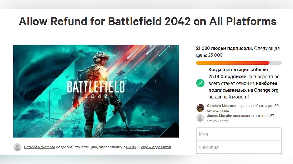 На сайте Change.org была запущена петиция, в которой игроки массово просят вернуть им средства за покупку Battlefield 2042. Все это происходит на волне недовольства игрой со стороны многих игроков. К примеру, на момент написания новости рейтинг игры в Steam составляет всего 30%.