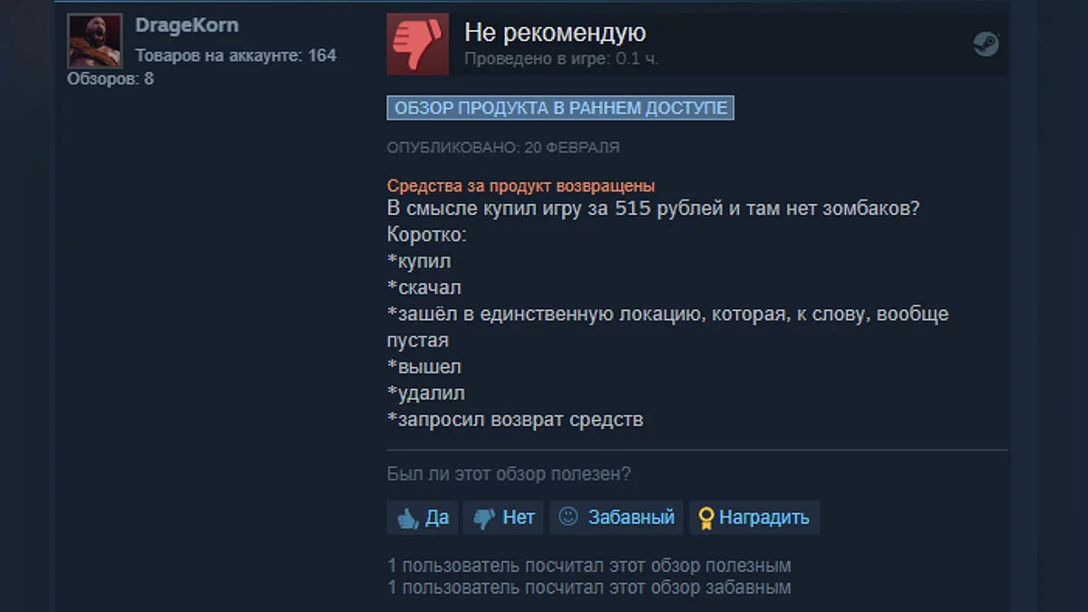 Игроки критикуют проект за отсутствие в нем зомби, хотя в описании к игре они упоминаются. А еще из минусов выделяют крайне малую долю контента, которая доступна на старте. Возможно, с выходом новых обновлений игру дополнят новым содержимым, но пока что, судя по отзывам, она очень сырая. Кстати, авторы уже успели выкатить апдейт 0.0.1b, в котором исправили некоторые баги.