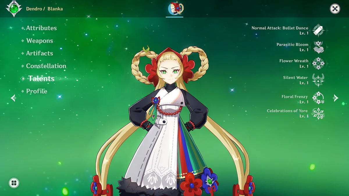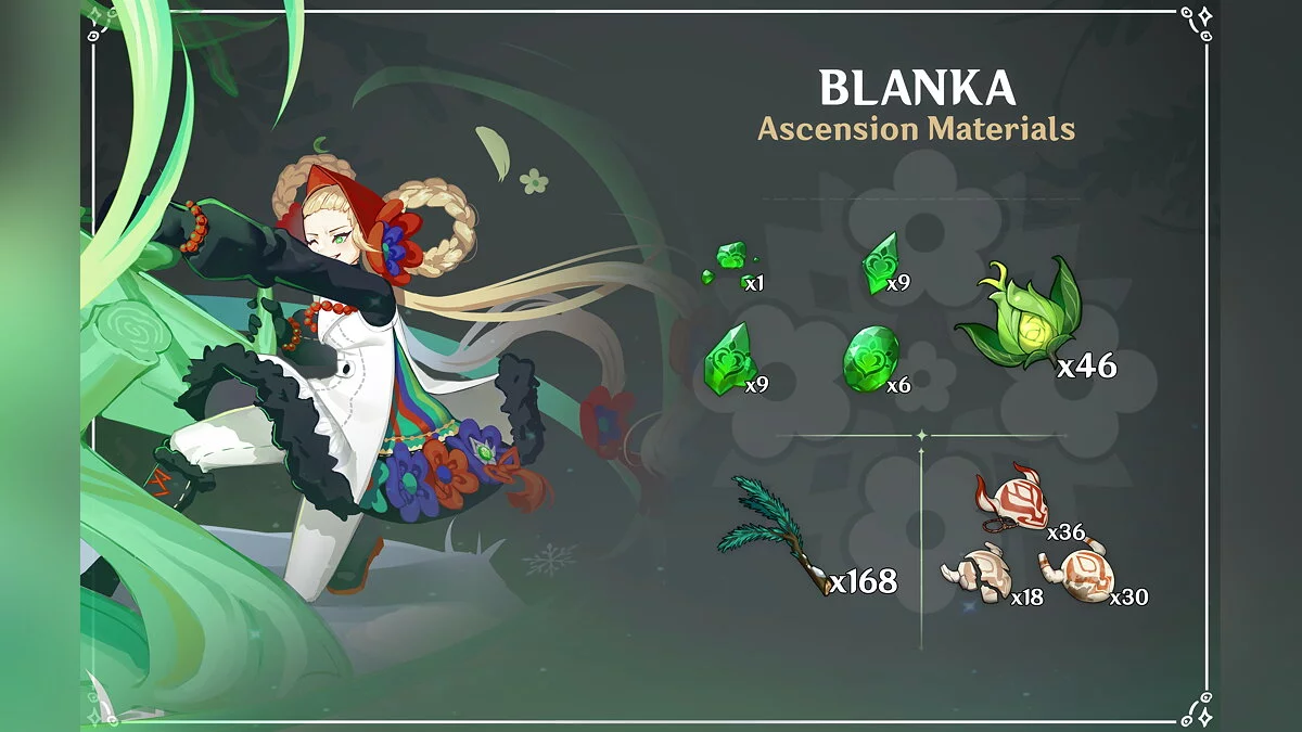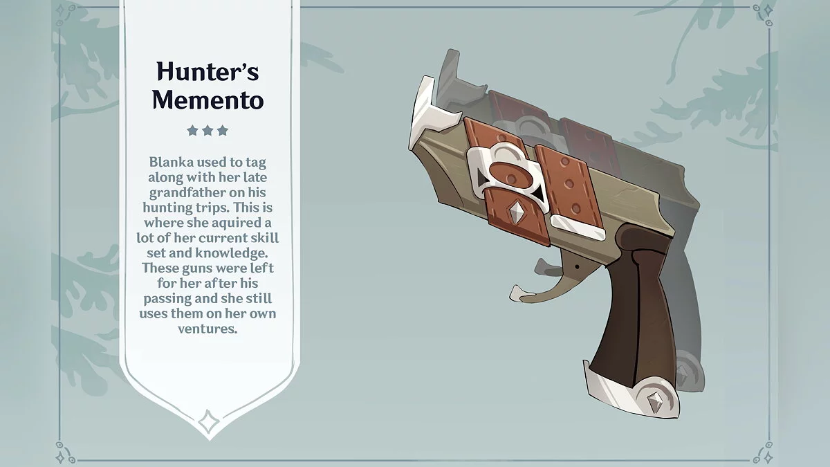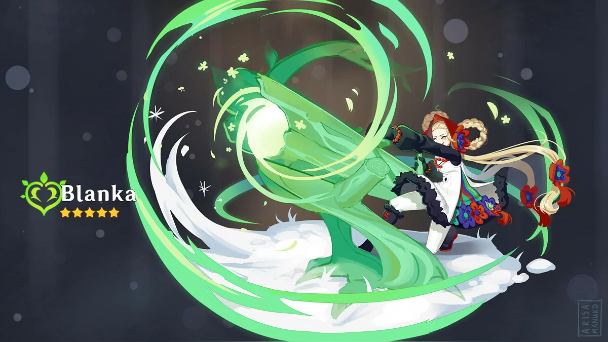 По задумке художницы, персонажа зовут Бланка — она родилась в регионе Сумеру. В бою героиня использует магию. Энтузиастка даже придумала ей собственное оружие со своими характеристиками — магические пистолеты.
