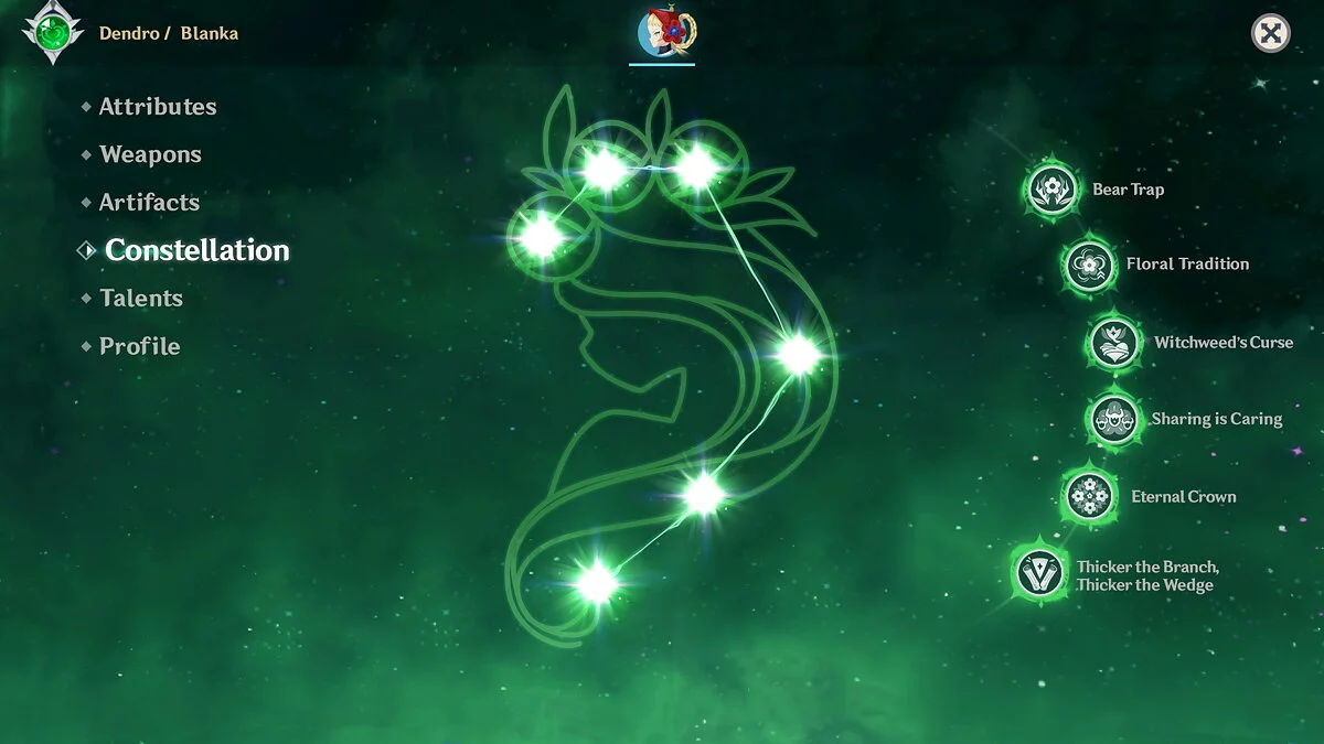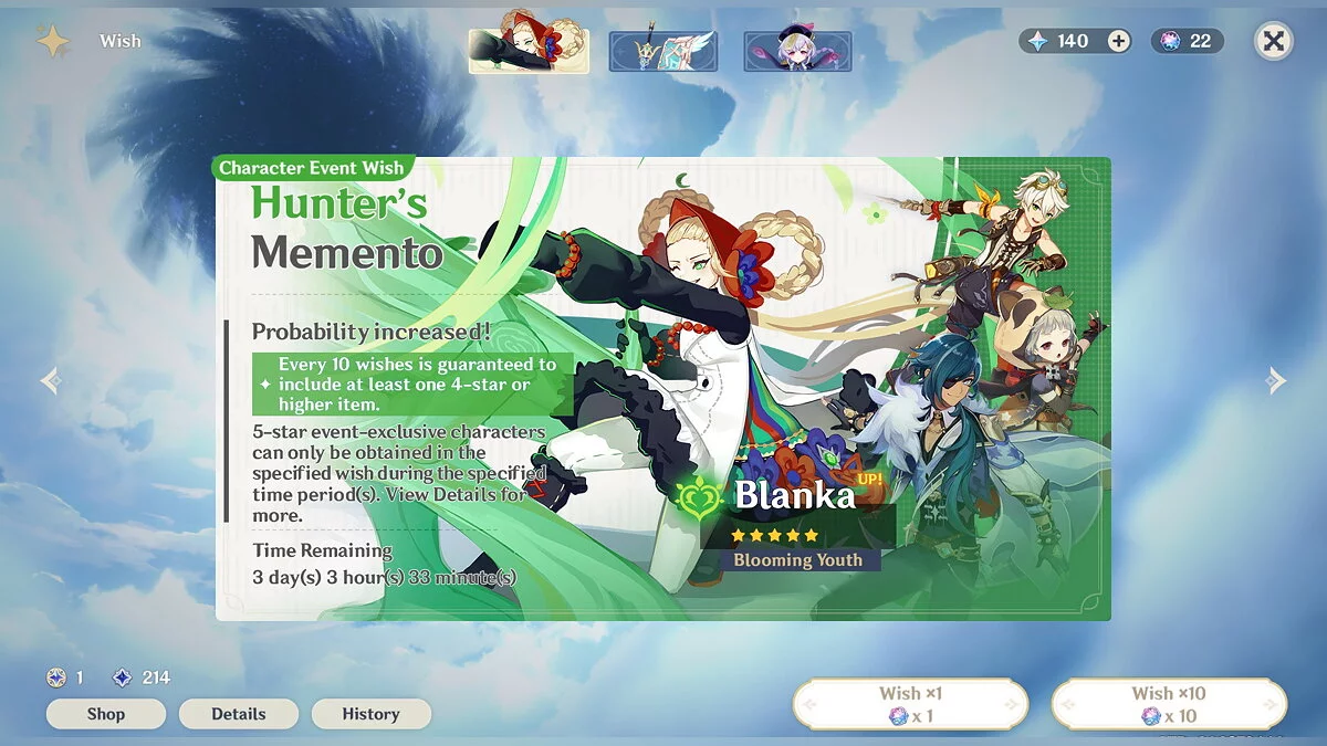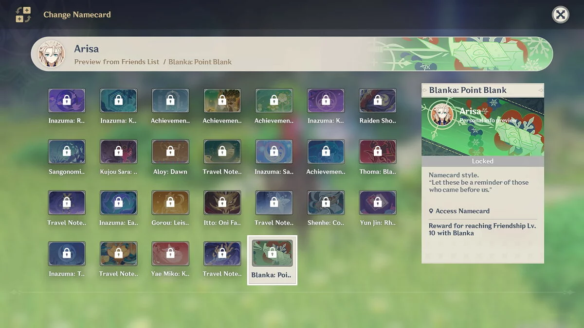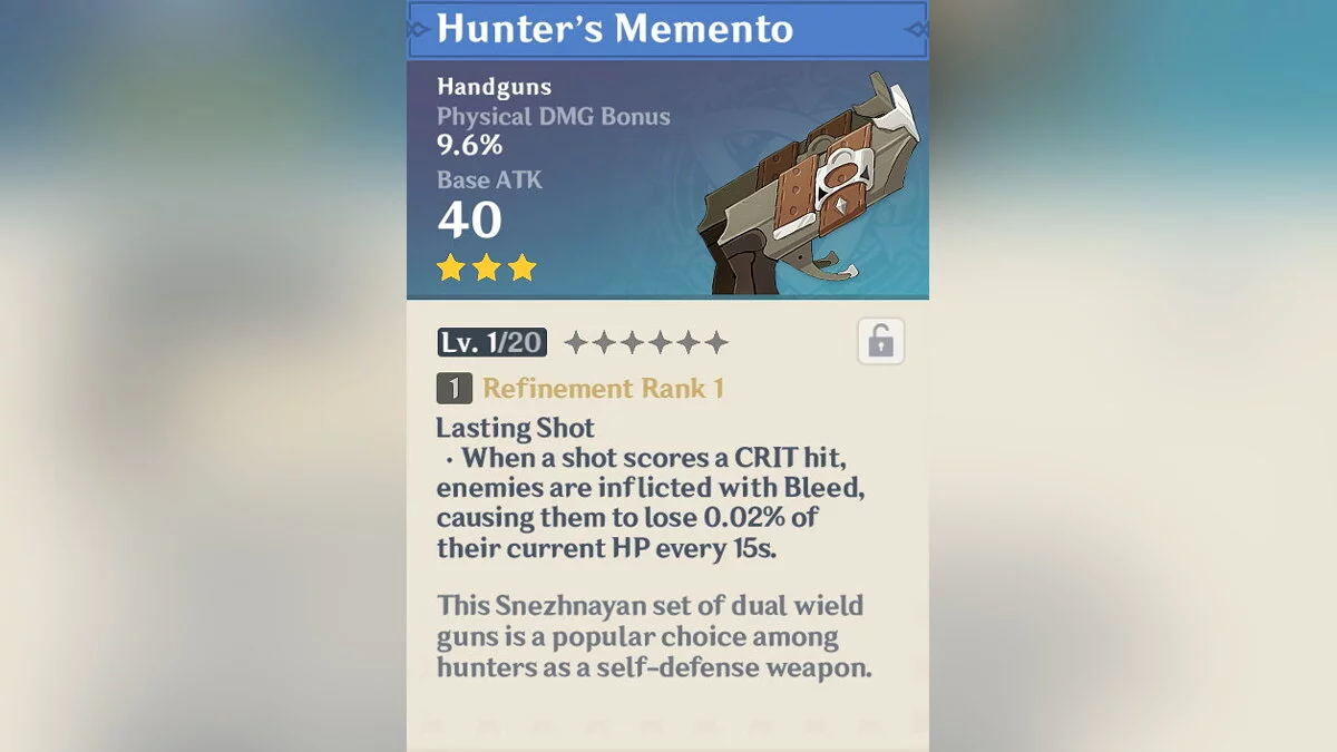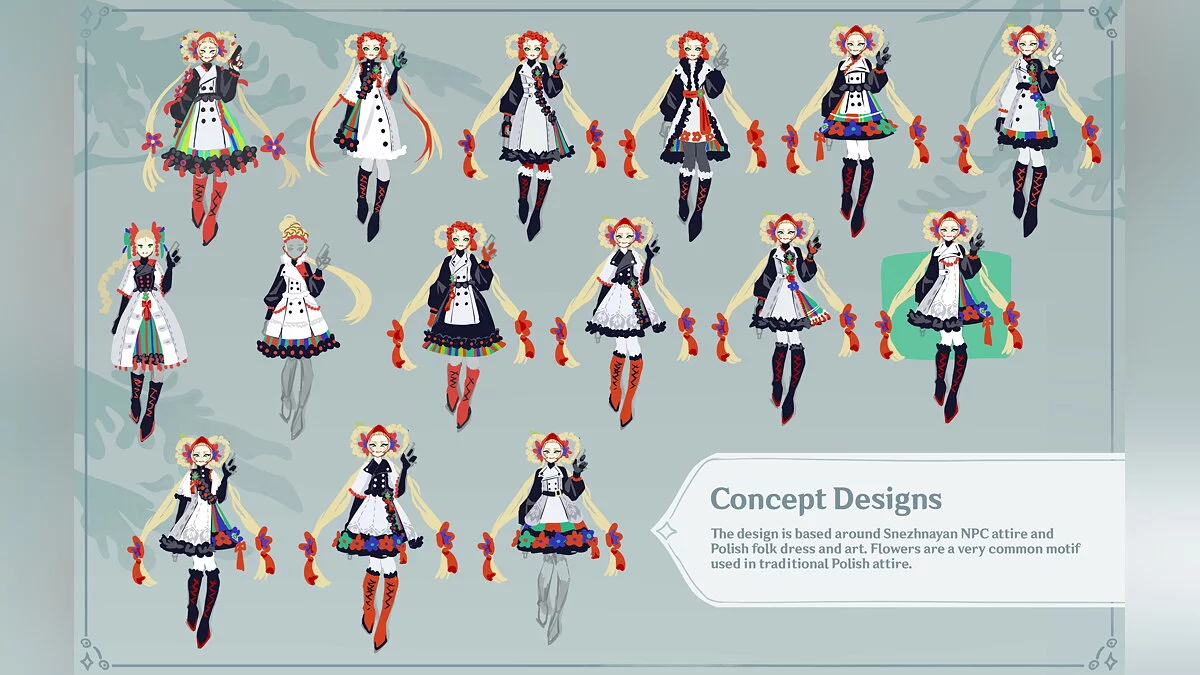 По задумке художницы, персонажа зовут Бланка — она родилась в регионе Сумеру. В бою героиня использует магию. Энтузиастка даже придумала ей собственное оружие со своими характеристиками — магические пистолеты.