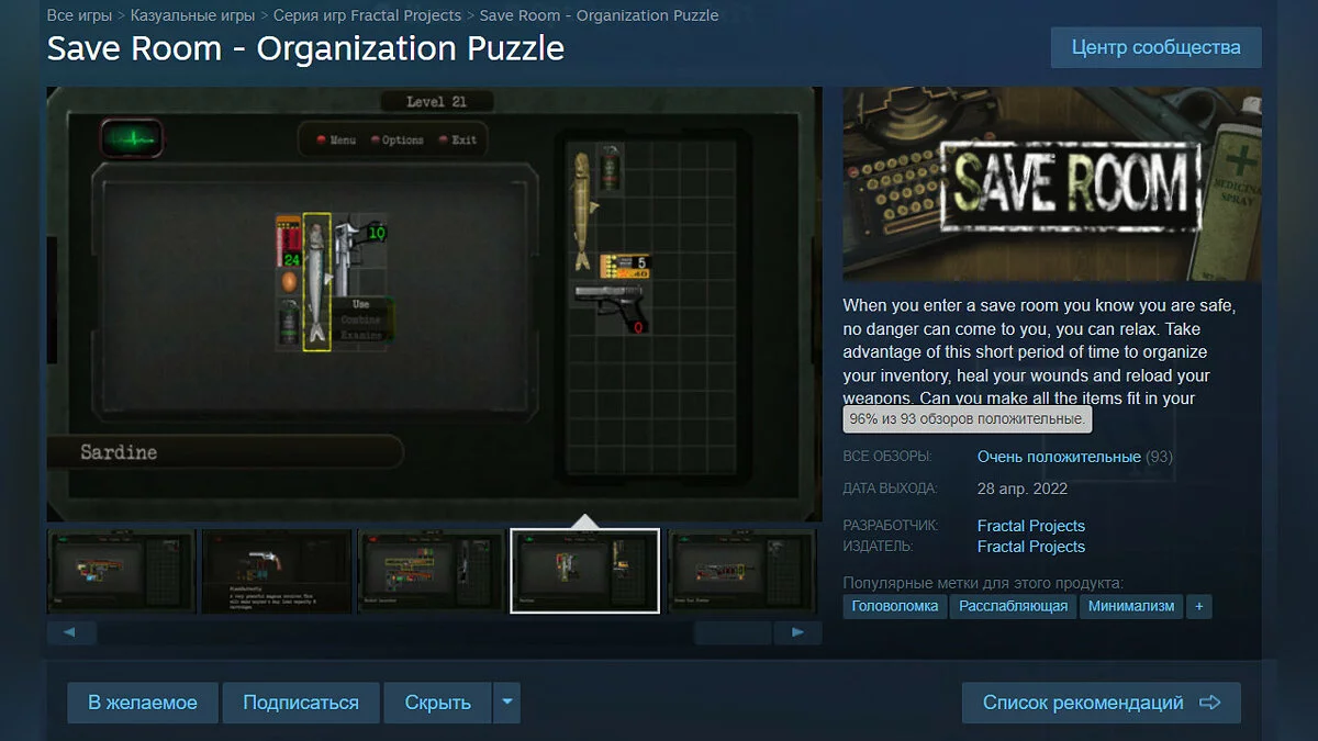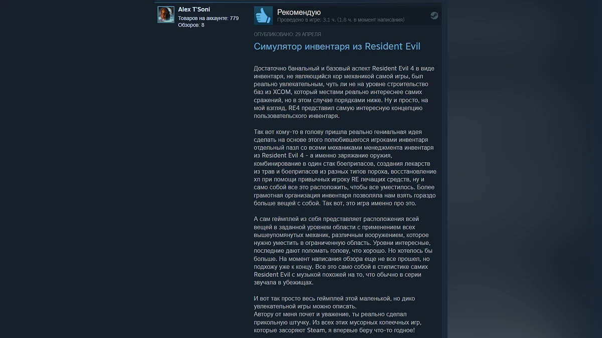 На днях в Steam вышла простая с технической стороны, но в то же время необычная игра под названием Save Room — Organization Puzzle. Весь геймплей имитирует «Тетрис», но вместо классических блоков игроки должны заполонять ячейки инвентаря из Resident Evil 4.